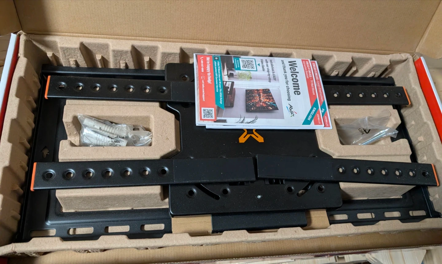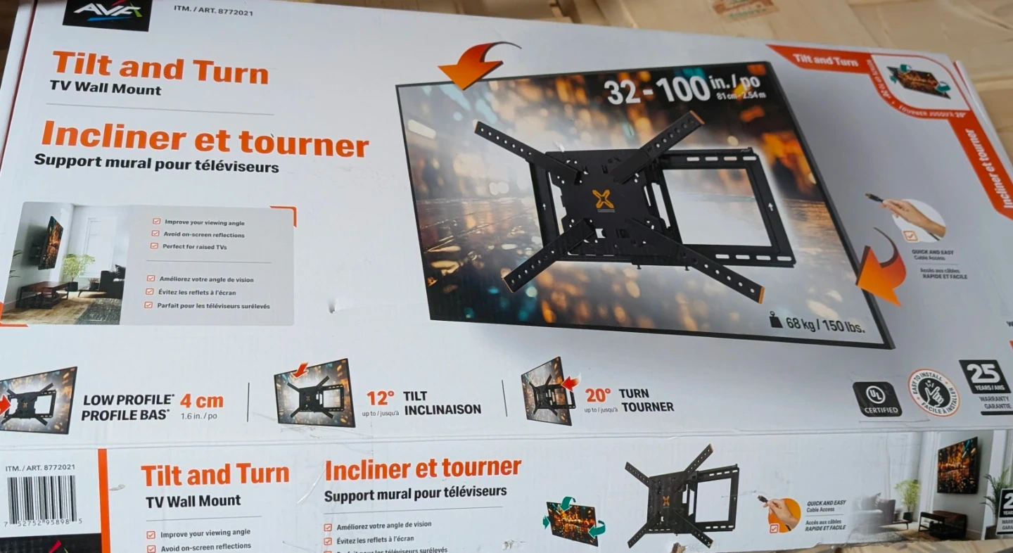 This AVA TV wall mount supports screens from 32 to 100 inches and has a weight capacity of 68 kg or 150 lbs. It offers a low profile of 4 cm and can tilt up to 12 degrees and turn up to 20 degrees. Includes all necessary hardware for installation.