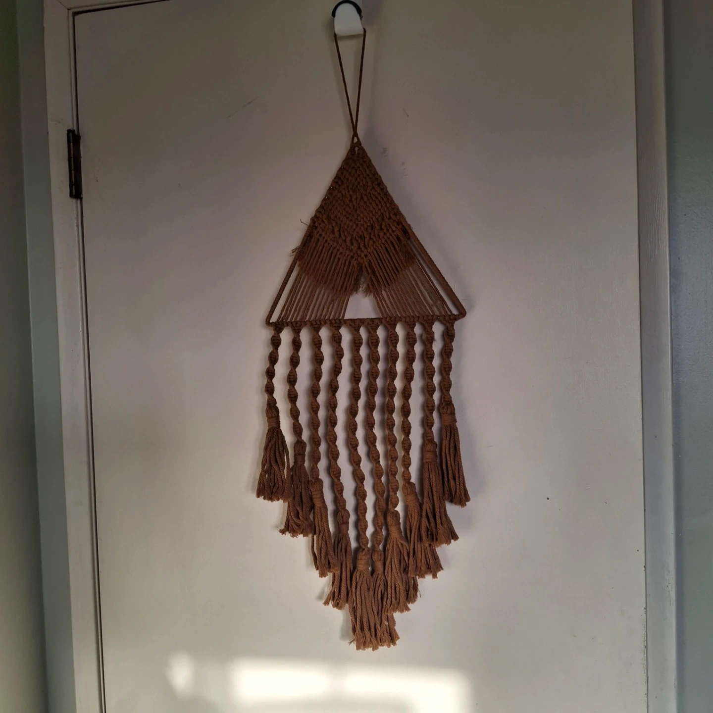 A brown macrame wall hanging with a triangle top and tassel details. It's made of woven cord. This piece adds a boho vibe to any room!