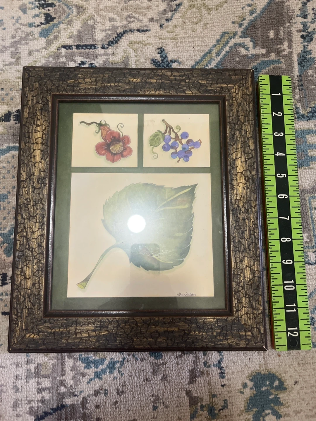 This framed art piece features three botanical illustrations: a flower, grapes, and a large leaf. The artist's signature "Chris Wilsker" is visible. It's housed in a textured dark wood-look frame. The overall dimensions are approximately 11 inches by 12 inches.