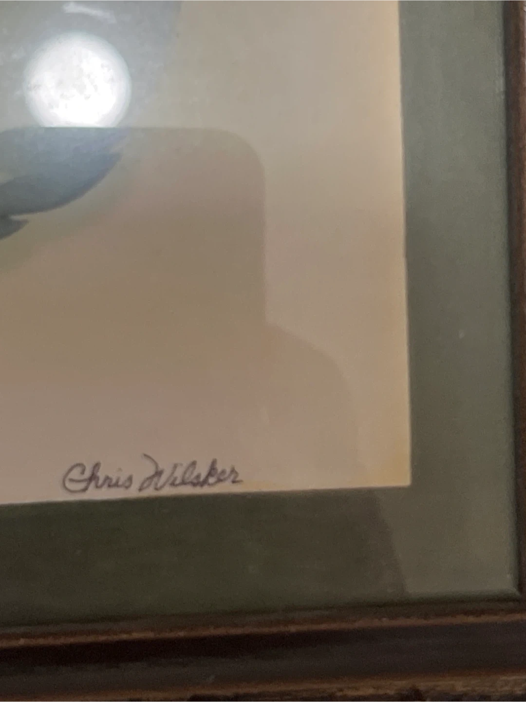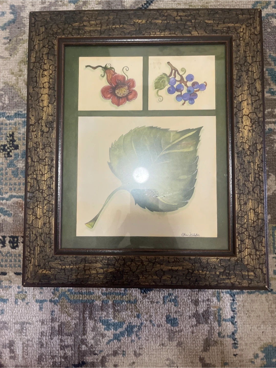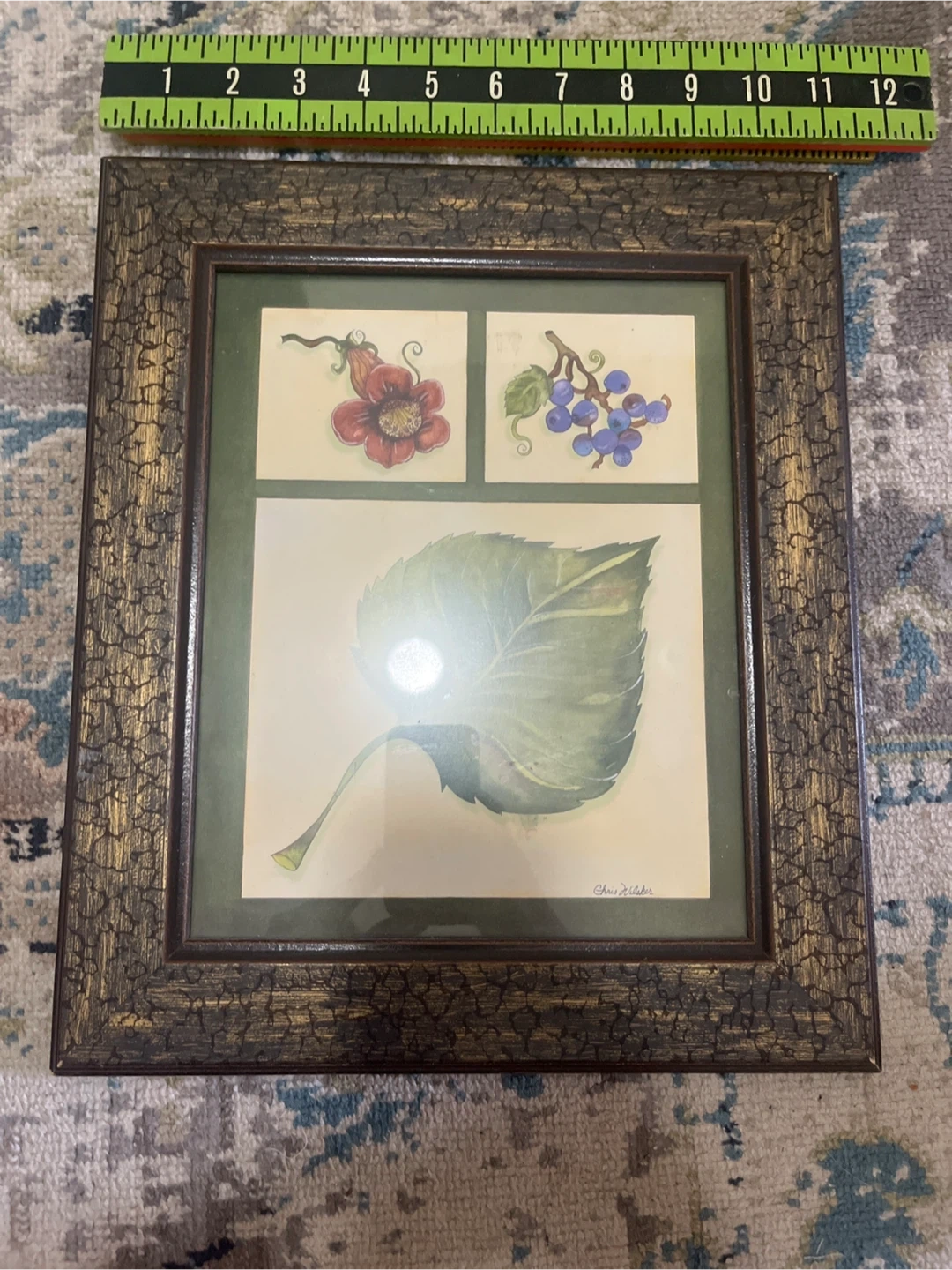 This framed art piece features three botanical illustrations: a flower, grapes, and a large leaf. The artist's signature "Chris Wilsker" is visible. It's housed in a textured dark wood-look frame. The overall dimensions are approximately 11 inches by 12 inches.