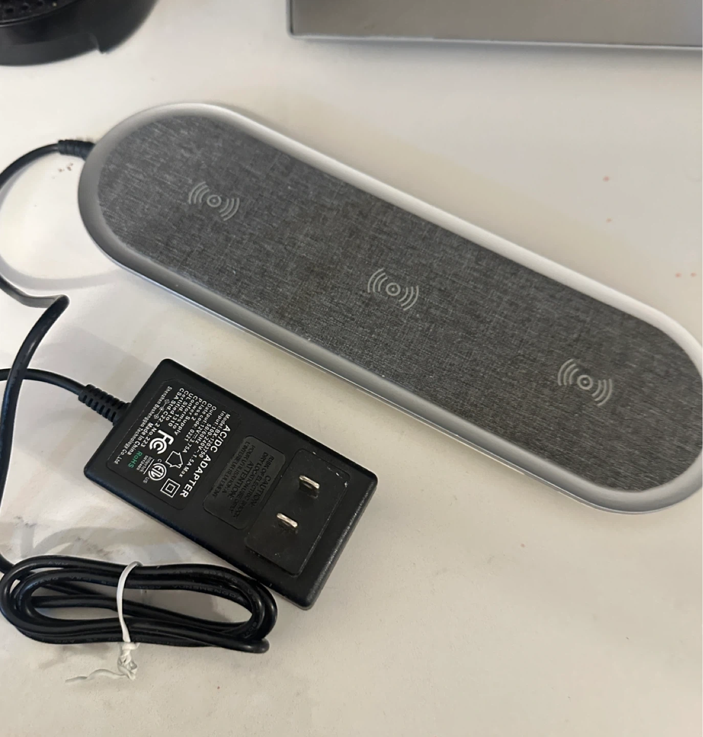 This is a Triple Wireless Charger with Two USB Ports and with an AC adapter. It has a grey fabric-like top surface and a silver metallic trim. Like new, excellent condition.