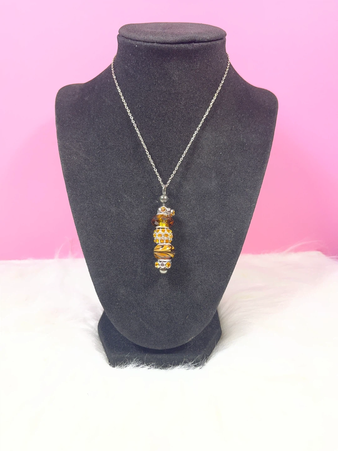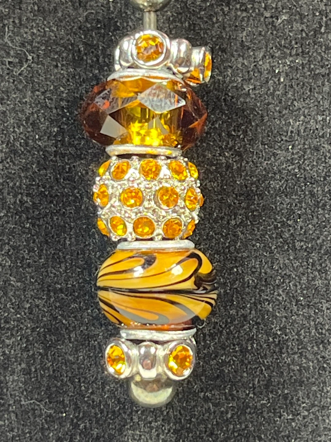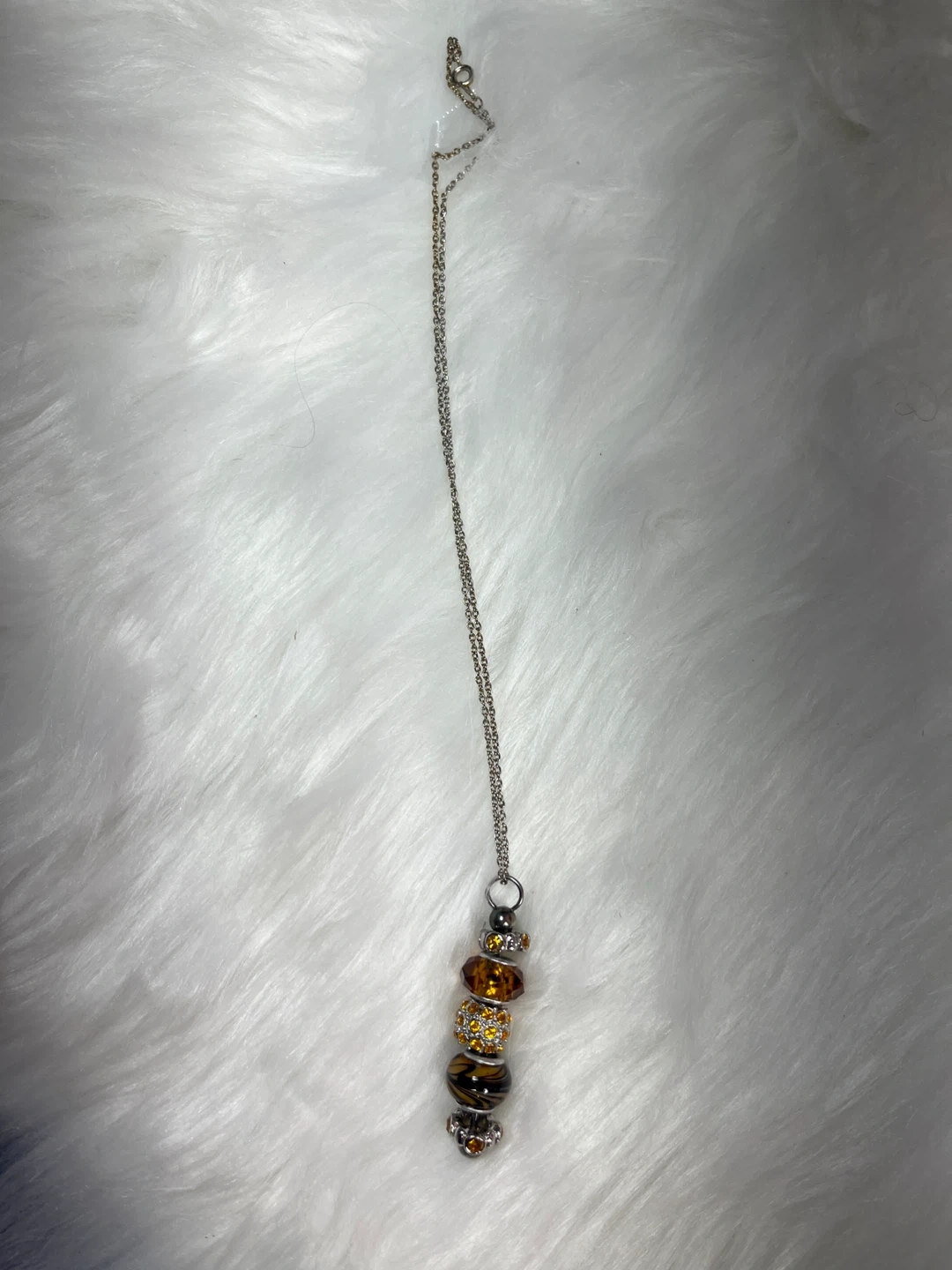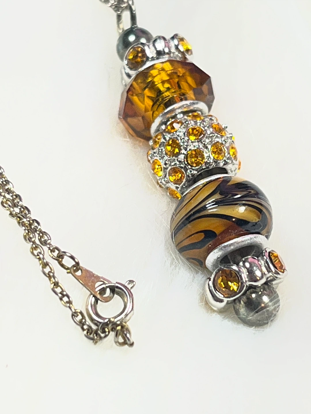 This charming necklace features a string of decorative beads including faceted amber-toned gems, a rhinestone-encrusted sphere, and a glass bead with a tiger stripe pattern. It's finished with a silver-tone chain and clasp. A lovely accessory to add a pop of colour!