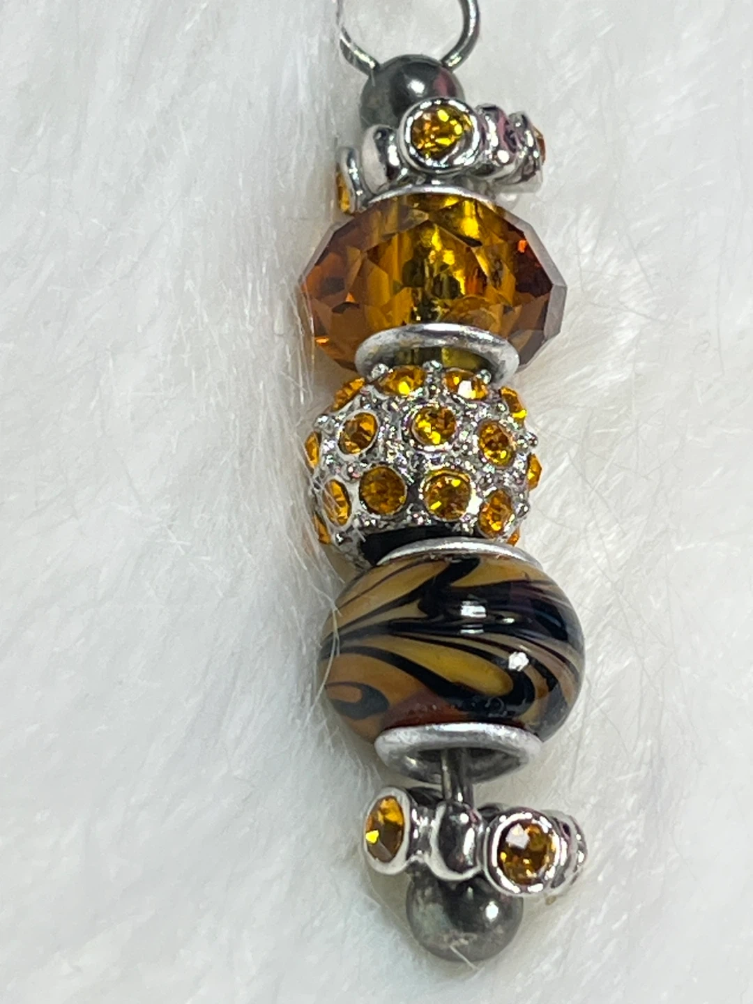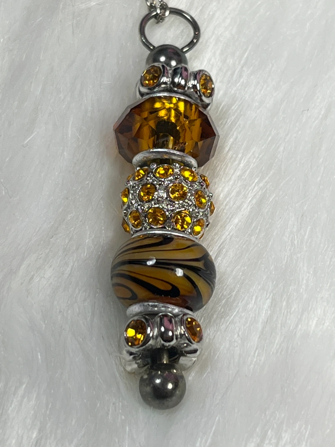 This charming necklace features a string of decorative beads including faceted amber-toned gems, a rhinestone-encrusted sphere, and a glass bead with a tiger stripe pattern. It's finished with a silver-tone chain and clasp. A lovely accessory to add a pop of colour!
