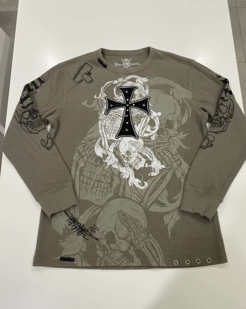 This Rebel Spirit long sleeve thermal shirt features a graphic print with skulls and a cross. It's made from a waffle knit fabric. The shirt is size large men