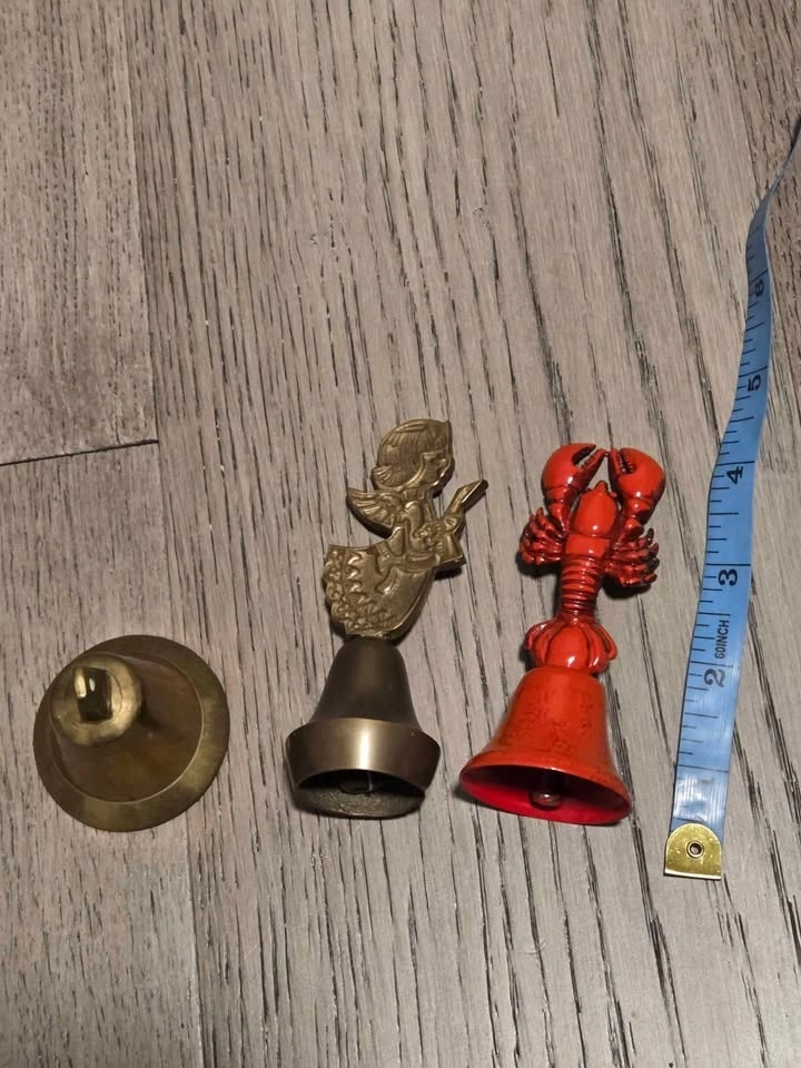 Includes a singing angel bell (brass), a shorter old bell (brass), and a metal lobster dinner bell. All are vintage and in good condition. Fabulous collection. Pick up in Oshawa near Ritson and Hillcroft.