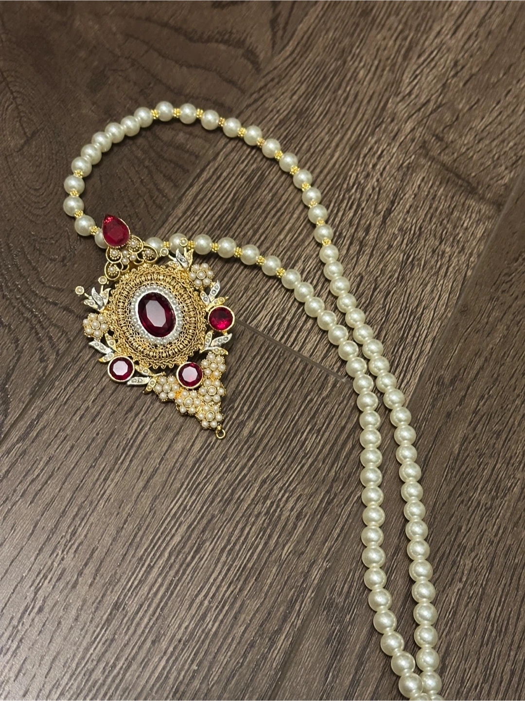 A beautiful pearl necklace featuring a detailed gold-tone pendant adorned with red faux gemstones. This piece adds an elegant royalty touch to any outfit. It's suitable for special occasions or everyday wear.