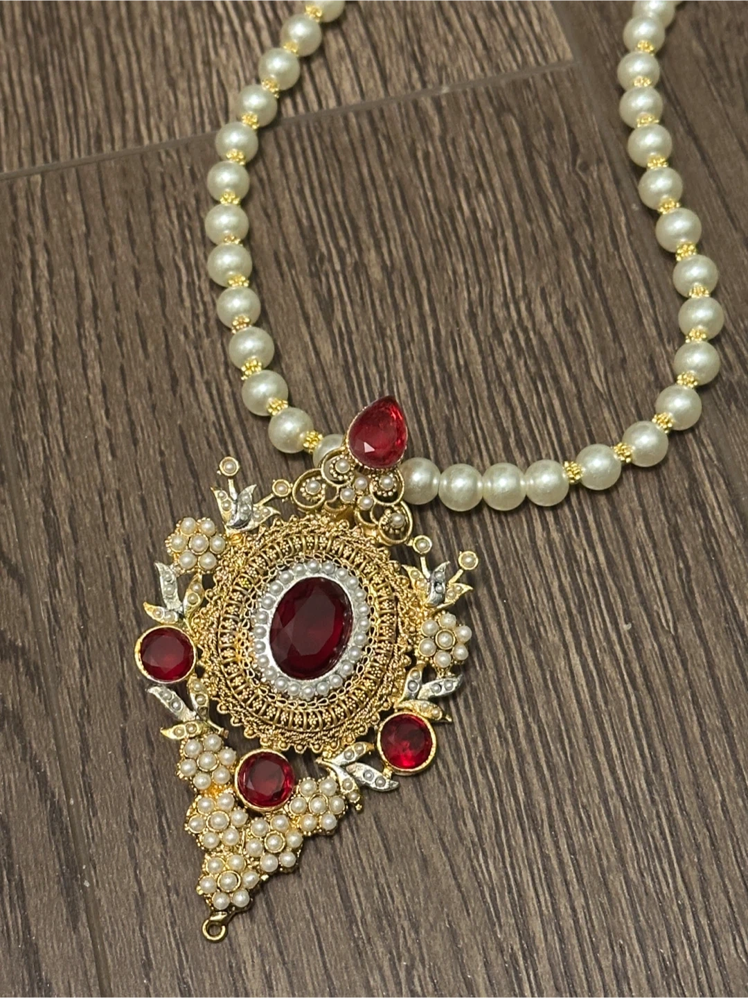 A beautiful pearl necklace featuring a detailed gold-tone pendant adorned with red faux gemstones. This piece adds an elegant royalty touch to any outfit. It's suitable for special occasions or everyday wear.