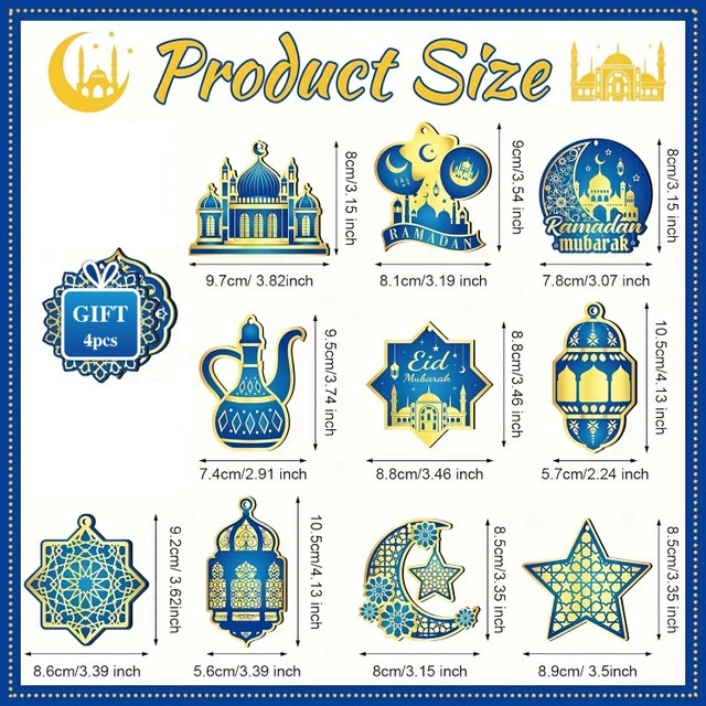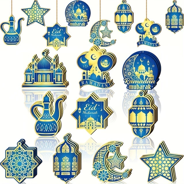 24 pieces of blue and golden Ramadan & Eid decorations. Features Islamic architecture, lanterns, stars & moons. Made of paper. Condition is new. Cash accepted.
