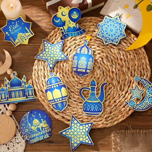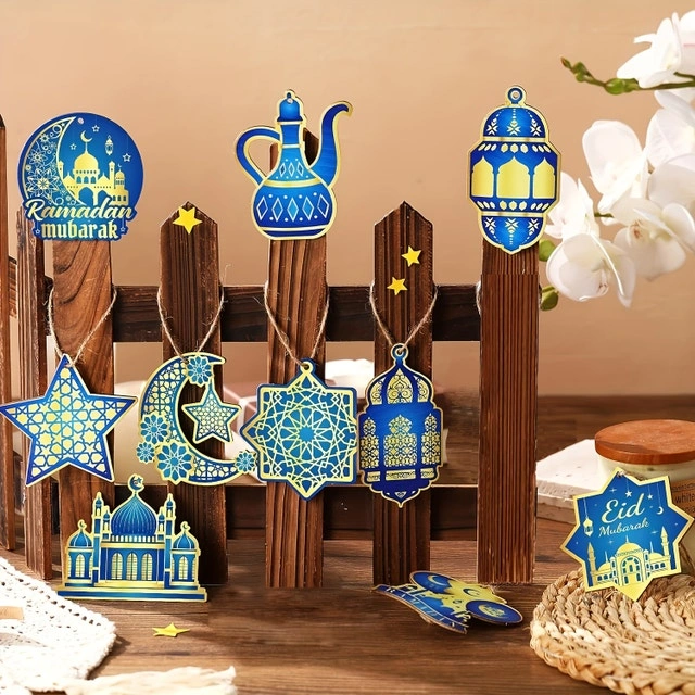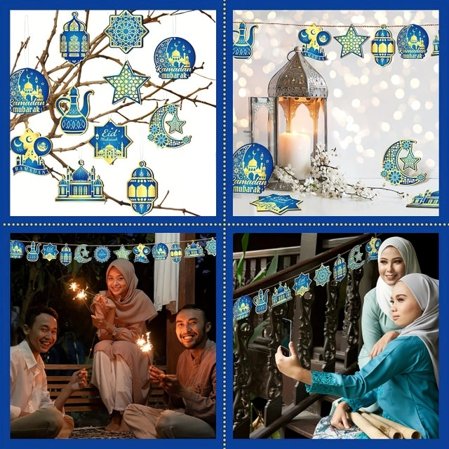 24 pieces of blue and golden Ramadan & Eid decorations. Features Islamic architecture, lanterns, stars & moons. Made of paper. Condition is new. Cash accepted.