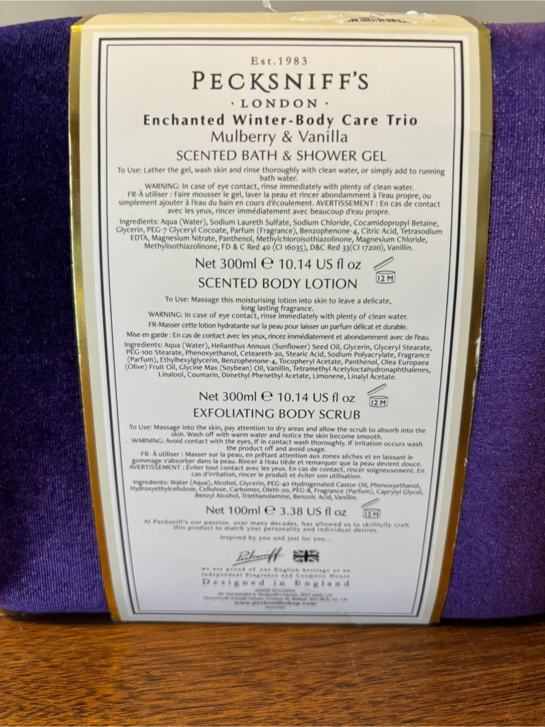 This Pecksniff's set includes Mulberry & Vanilla scented bath & shower gel, body lotion, and exfoliating body scrub(300 ml). It comes in a soft purple velvet travel bag. Brand new and sealed. Cash only.