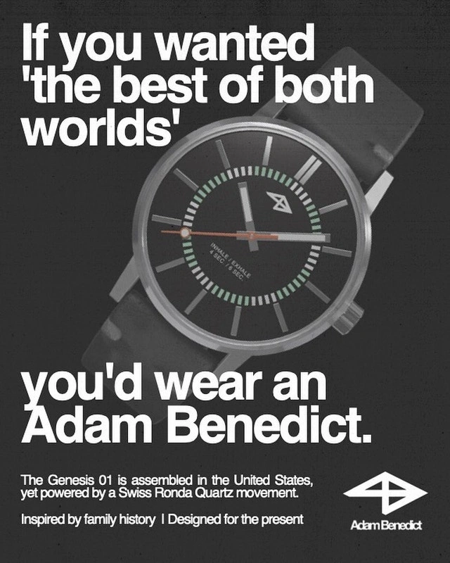 Up for sale is the Adam Benedict Genesis 01, a limited edition watch from an emerging microbrand with a history tracing back to the 1910s. This is their very first model, with only 50 pieces ever made. It features a striking matte black dial with applied markers, two-tone lume for the minute/second markers, and a vibrant orange seconds hand. The durable 316L steel case measures 40mm and houses a reliable Swiss Ronda 704 quartz movement, known for its accuracy. The watch is protected by an anti-reflective sapphire crystal and is water-resistant up to 100 meters. It comes with both a genuine Italian leather strap and an additional NATO-style strap. This American-assembled watch is noted for its exceptional quality and was a contender for the 2022 GPHG Awards. It's brand new and includes the original cedar presentation box, canvas travel pouch, orange NATO strap, spring bar tool, and microfiber cloth. Price is $350. Available for cash or cashless payment. Owner is selling.