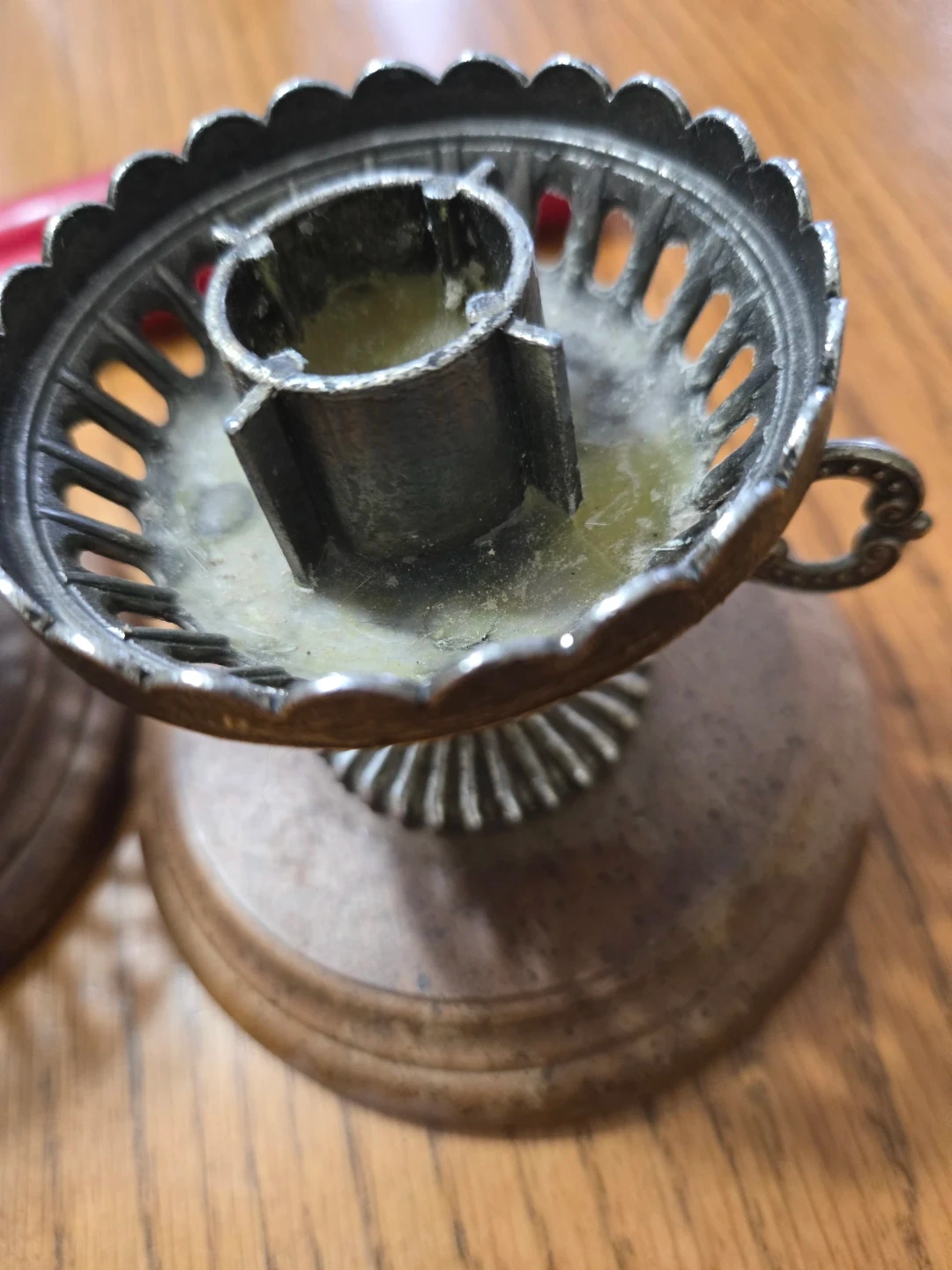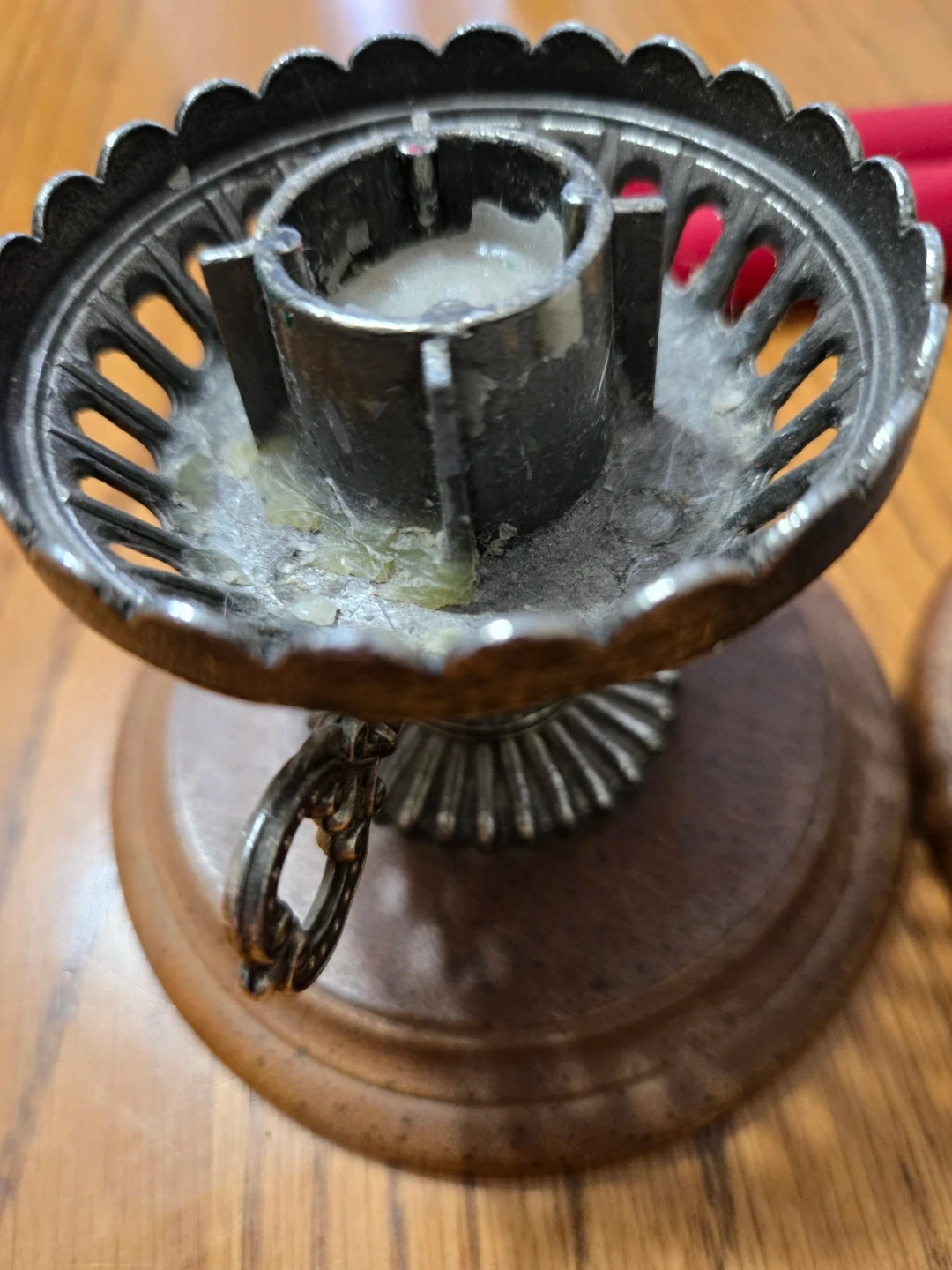 Two decorative candle holders featuring a metal top with a scalloped edge and a wooden base. They're perfect for adding a touch of vintage charm to your home decor. Includes Does not come with candles.
