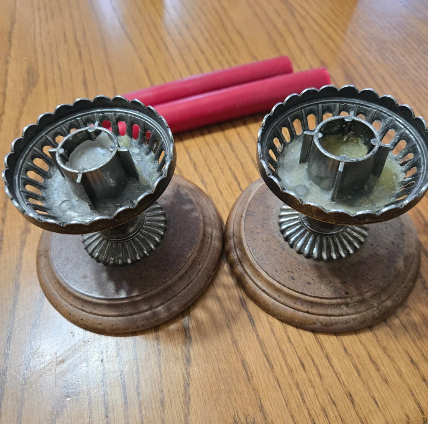 Two decorative candle holders featuring a metal top with a scalloped edge and a wooden base. They're perfect for adding a touch of vintage charm to your home decor. Includes Does not come with candles.