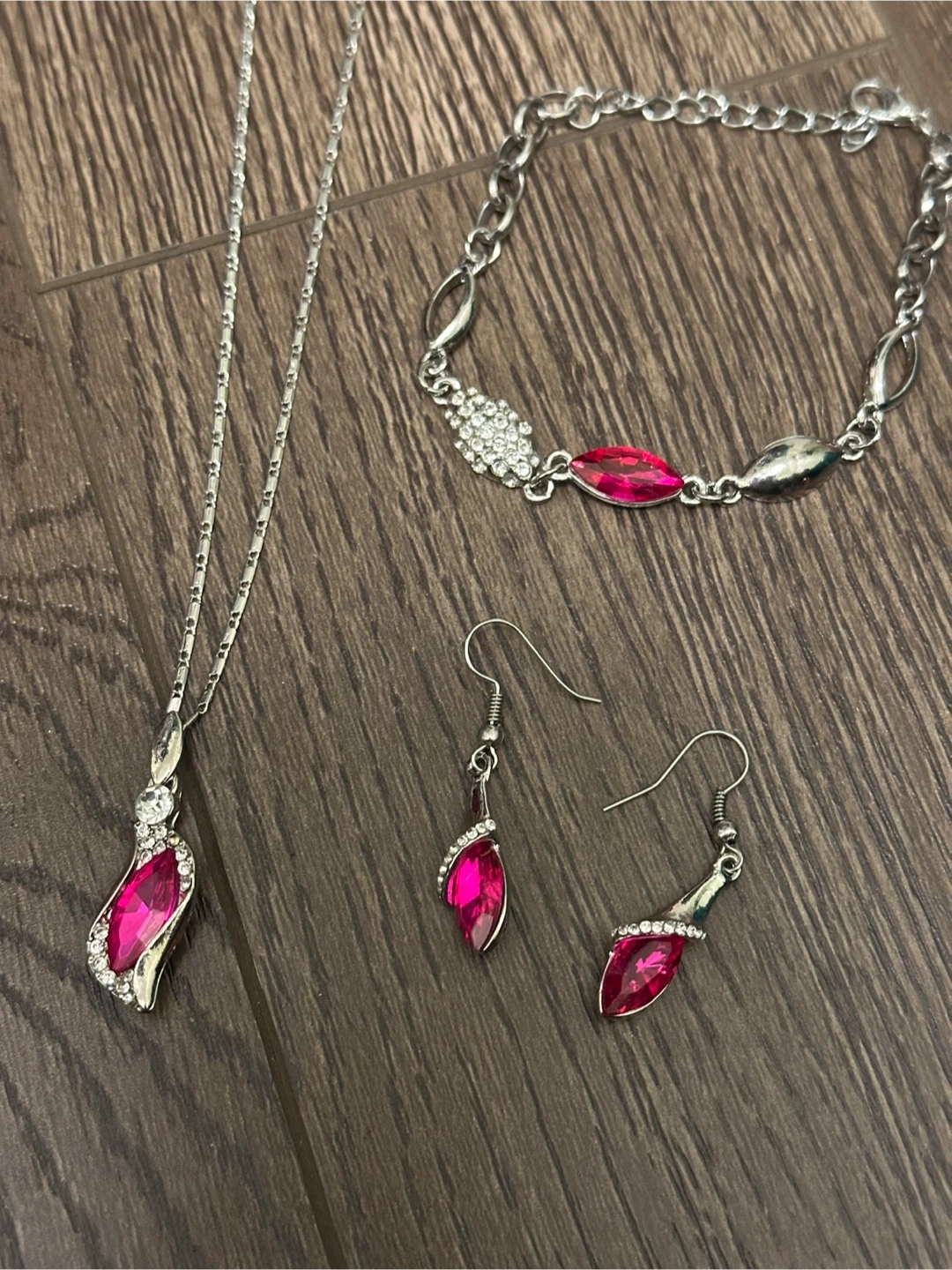 This set includes a necklace, bracelet, and earrings, all with silver-toned metal and accented with bright pink, marquise-cut gems surrounded by clear rhinestones. The necklace features a delicate chain and a matching pendant. The bracelet has a link design with several decorative elements. These are hook-style earrings. This set adds a pop of colour to any outfit!