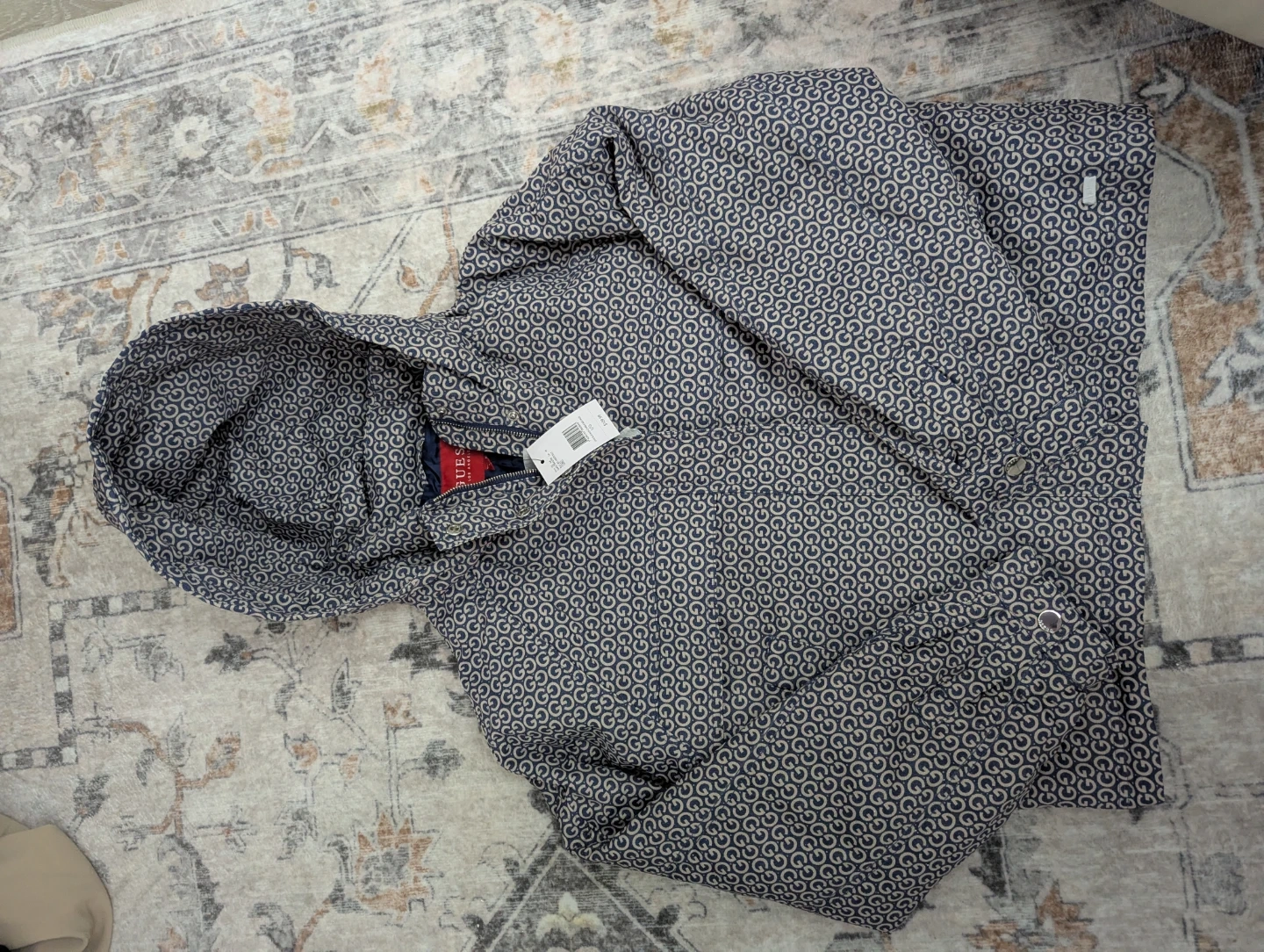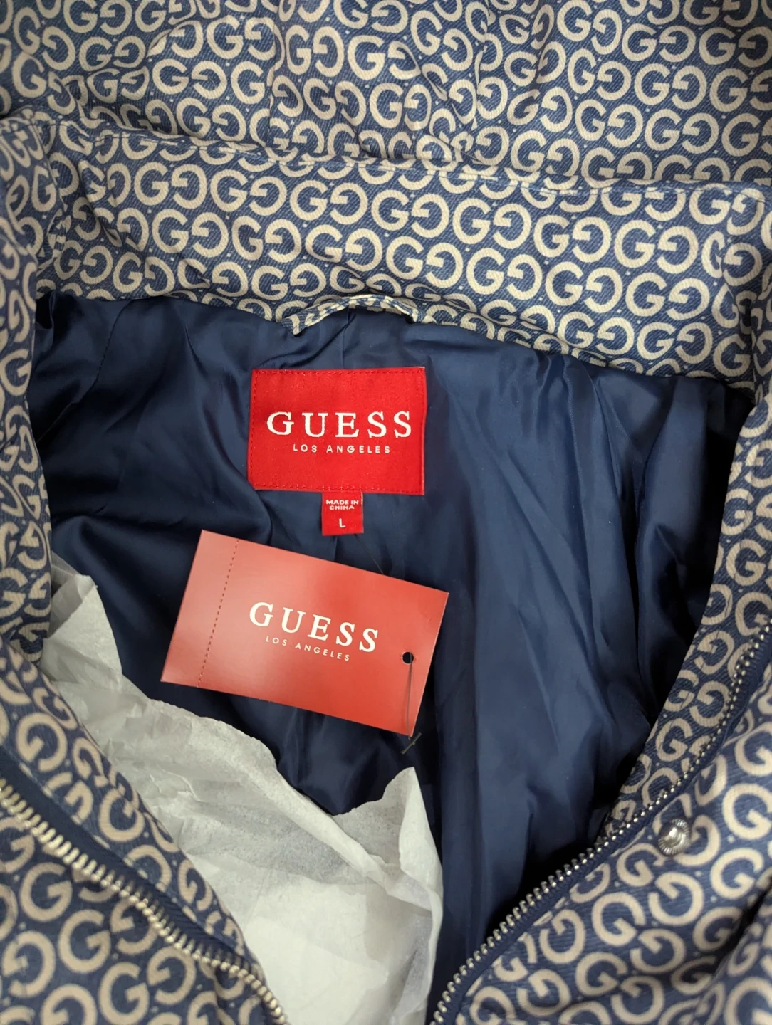 Never used! Guess puffer jacket with all-over G logo print. It's a size large. This jacket is a great option for cooler weather!