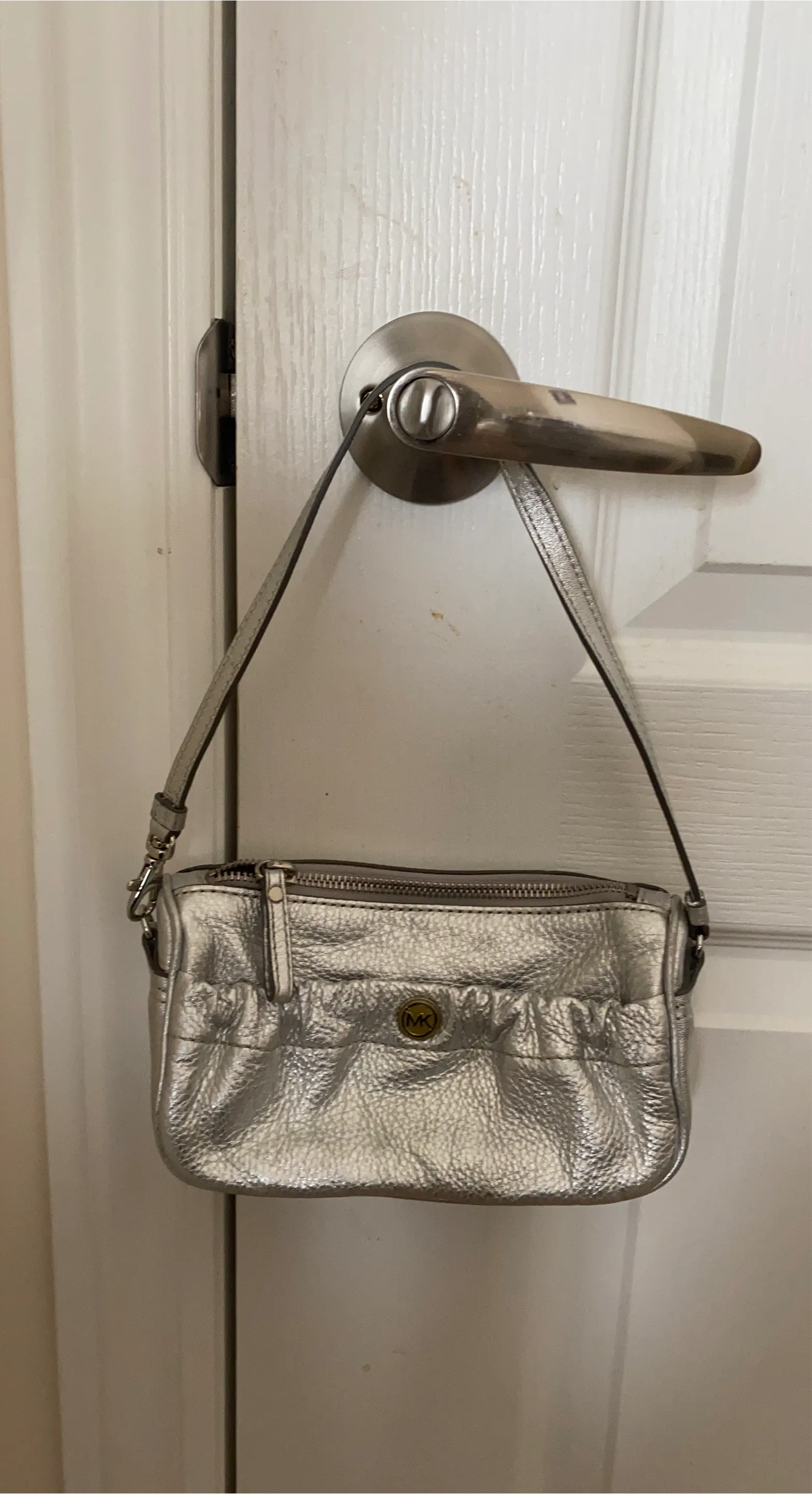 Silver Michael Kors mini bag . It has a zippered top and a small logo emblem. This bag is perfect for carrying essentials.