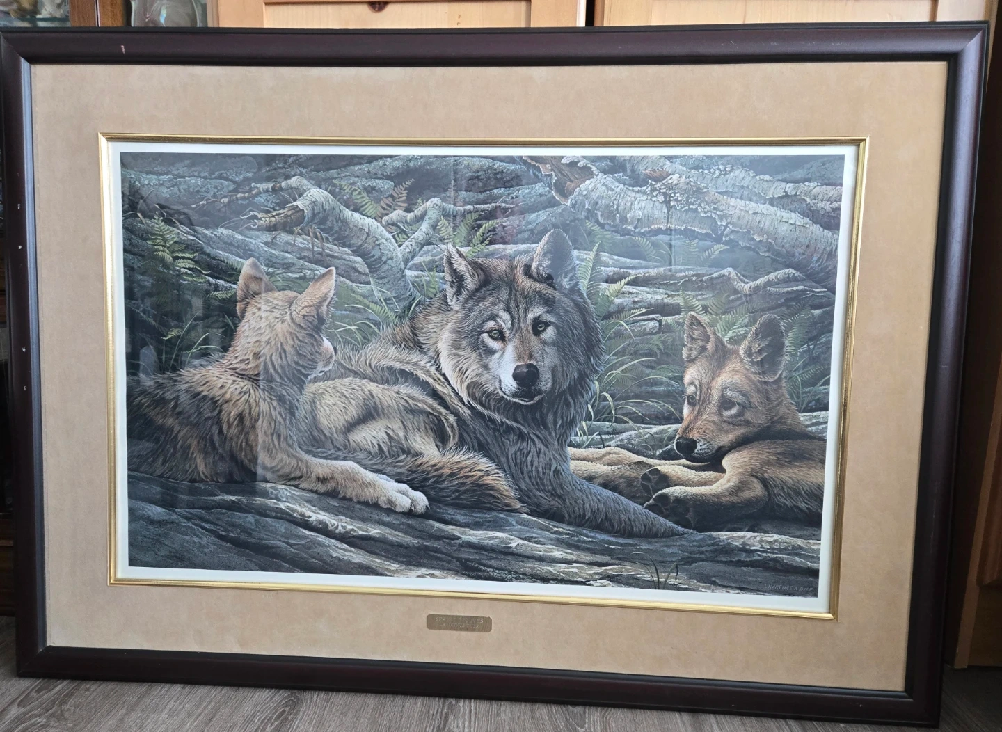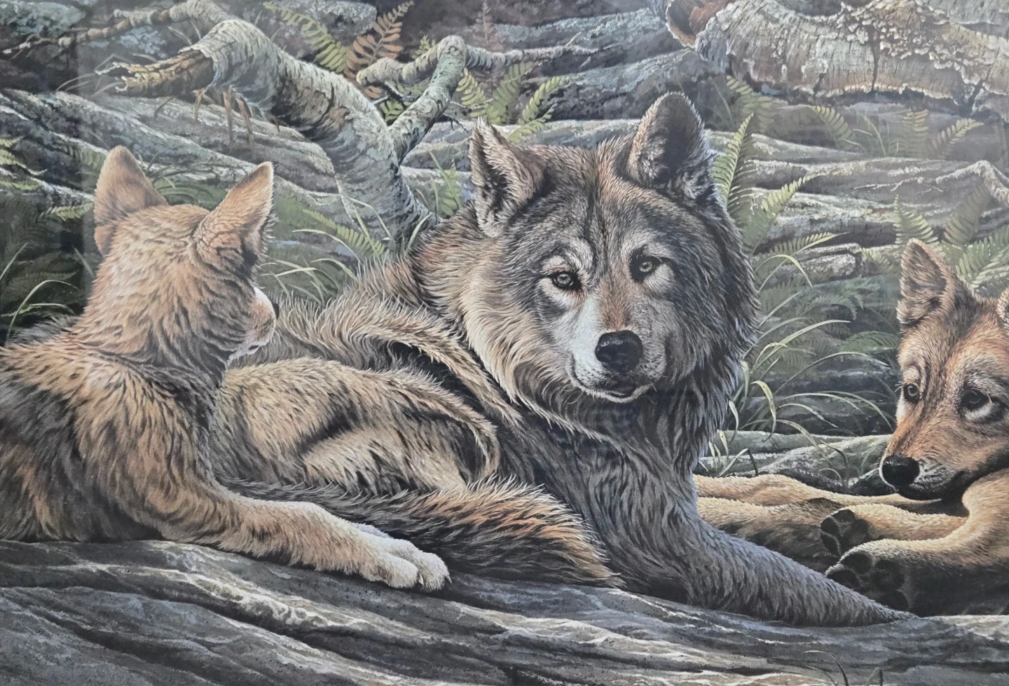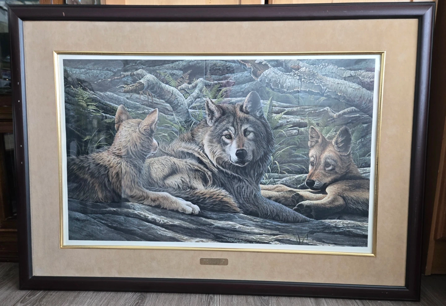 Beautifully Framed art print titled "Spring Wolves" by Lawrence A. Dyer 1989.The artwork depicts three wolves in a forest setting. Includes a plaque with the title and artist's name. It's a beautiful piece for any nature enthusiast's home.