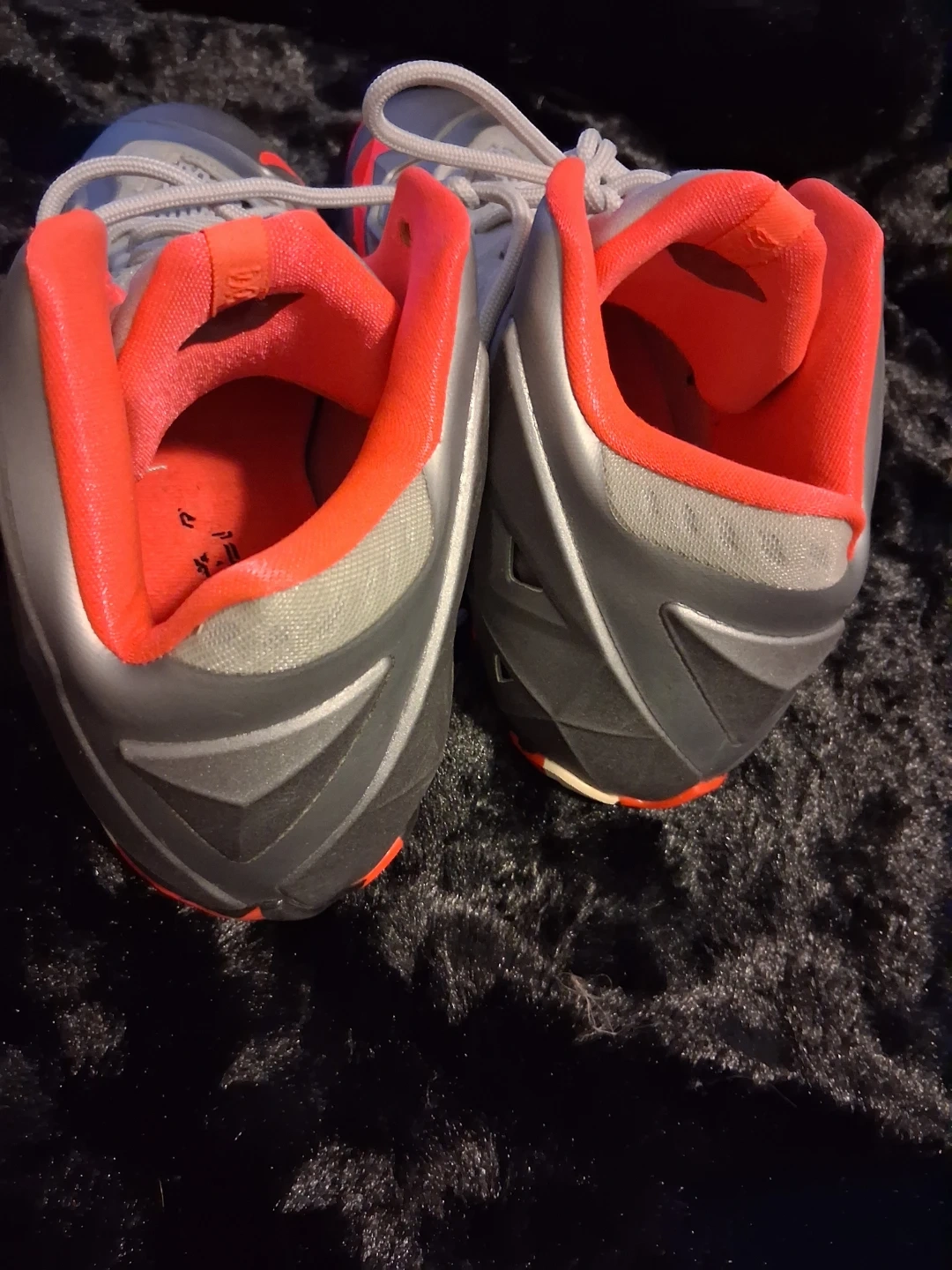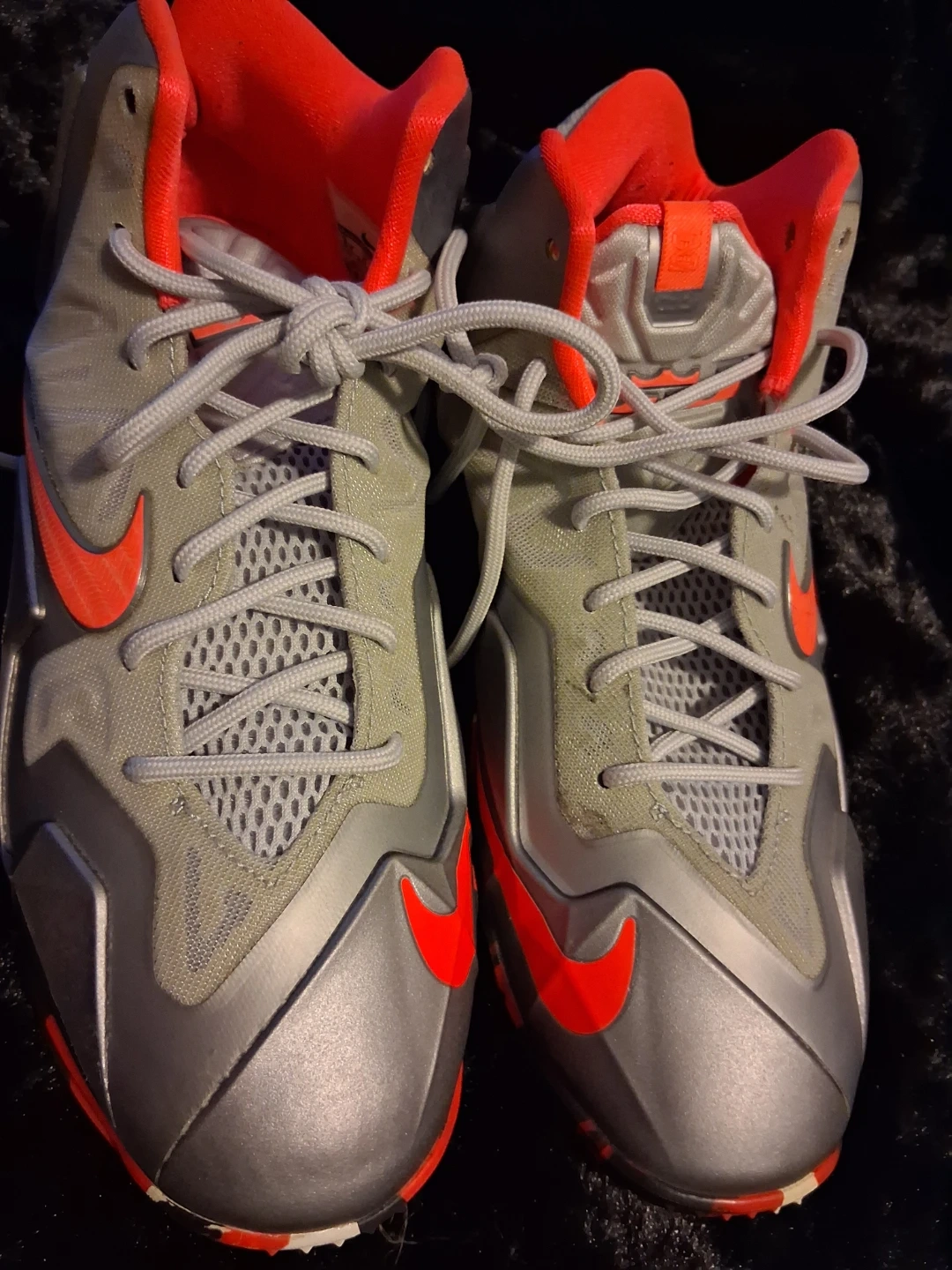 These Nike LeBron 11 basketball shoes are in a grey, silver, and red colorway. They feature a bold design with the signature Swoosh and LeBron branding. The rubber outsole offers excellent traction on the court.