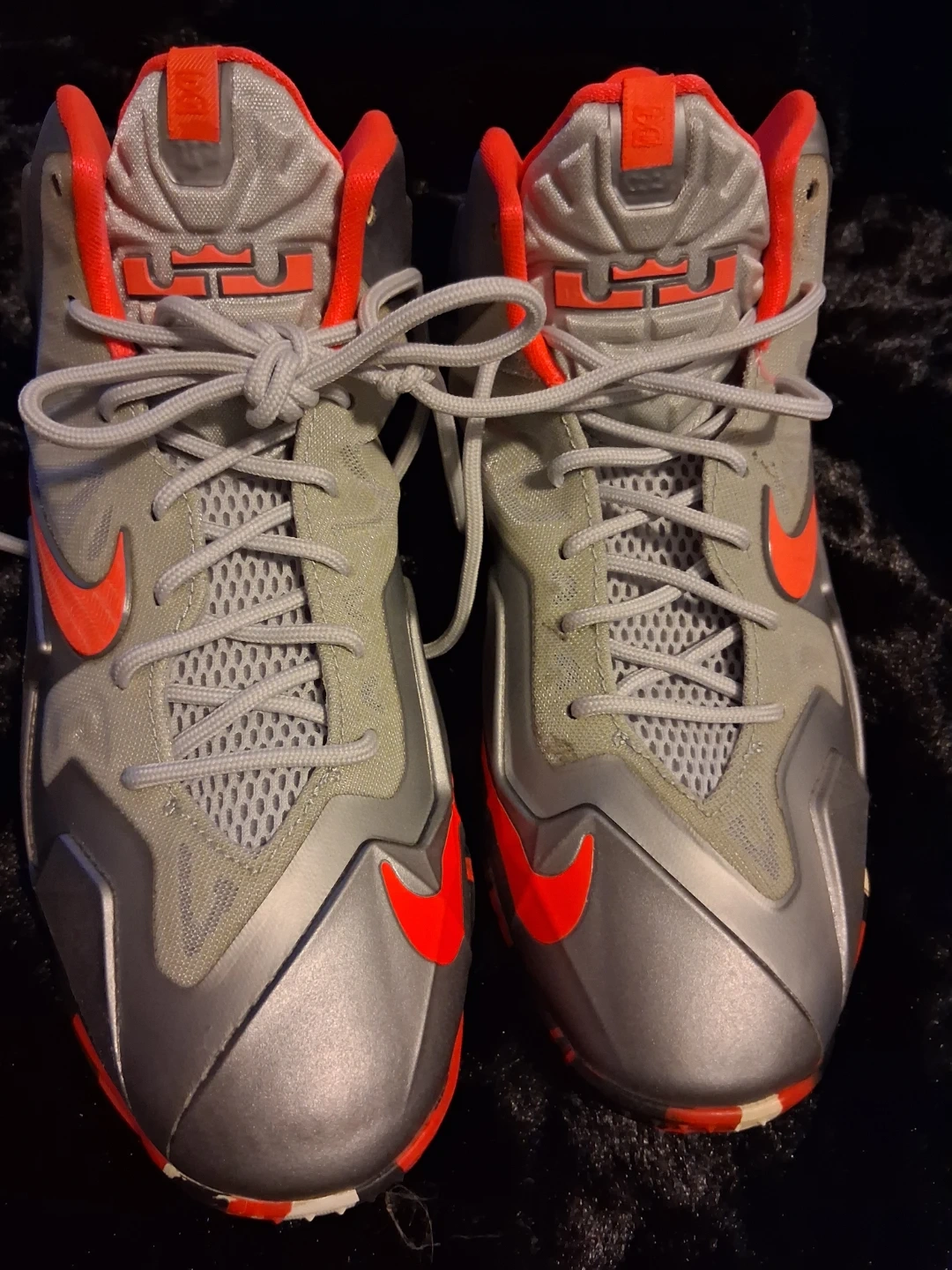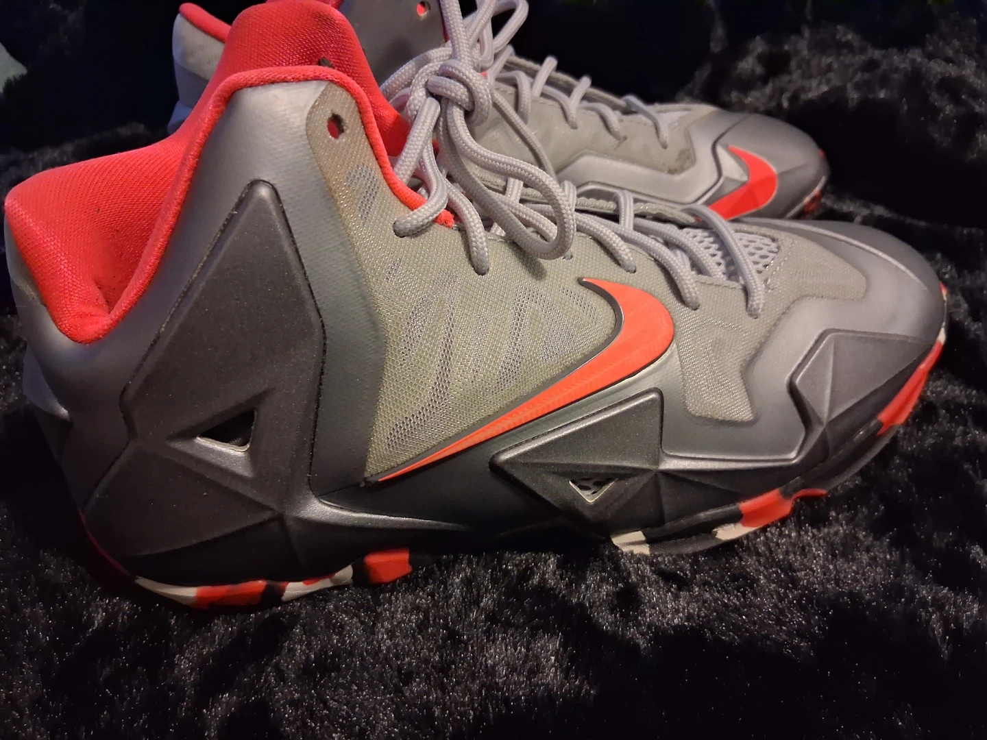 These Nike LeBron 11 basketball shoes are in a grey, silver, and red colorway. They feature a bold design with the signature Swoosh and LeBron branding. The rubber outsole offers excellent traction on the court.