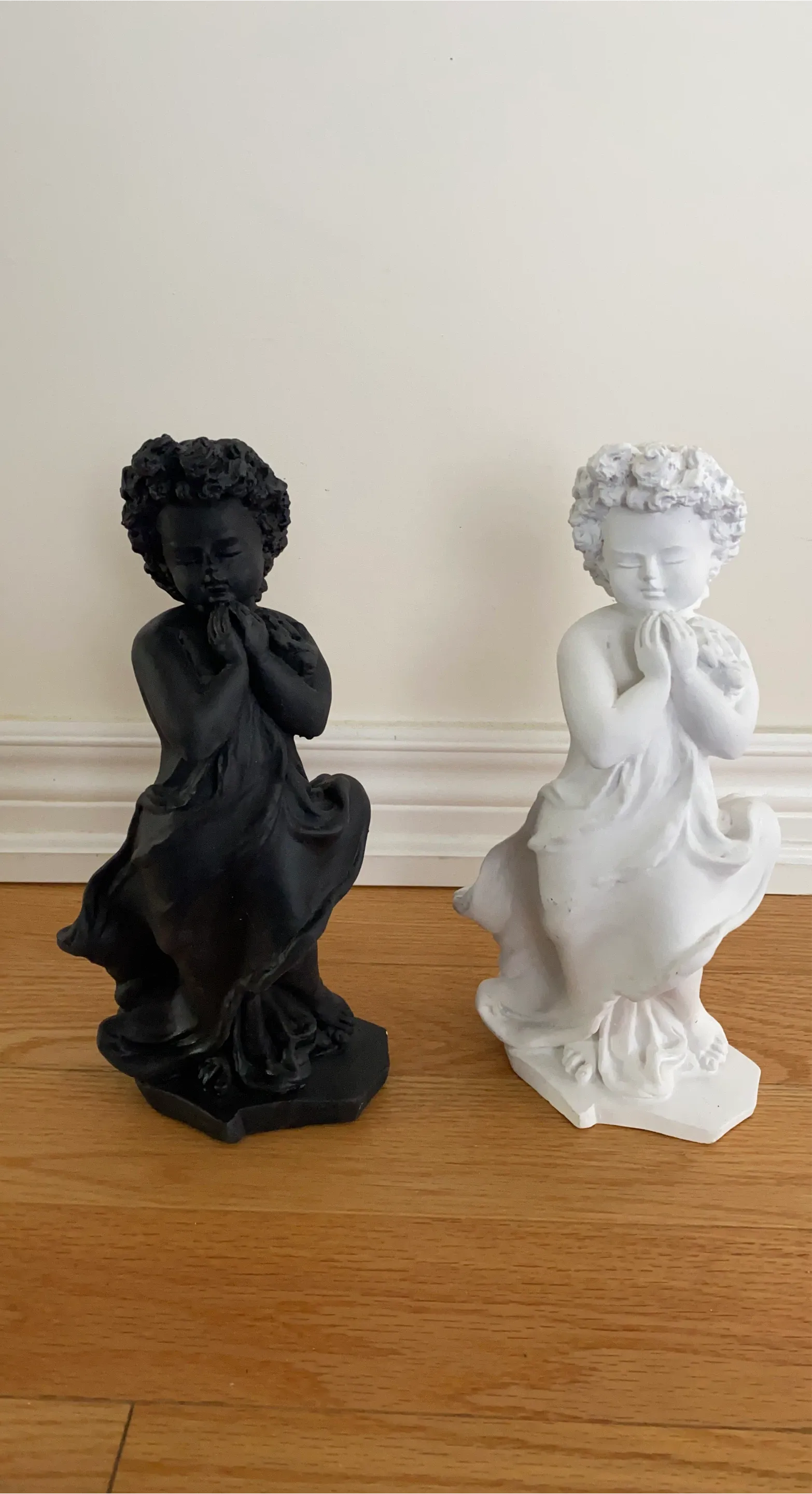 You get a set of two cherub figurines, one in black and one in white. They're made of a solid material and depict a child in prayer. These would add a touch of elegance to any shelf or mantelpiece.