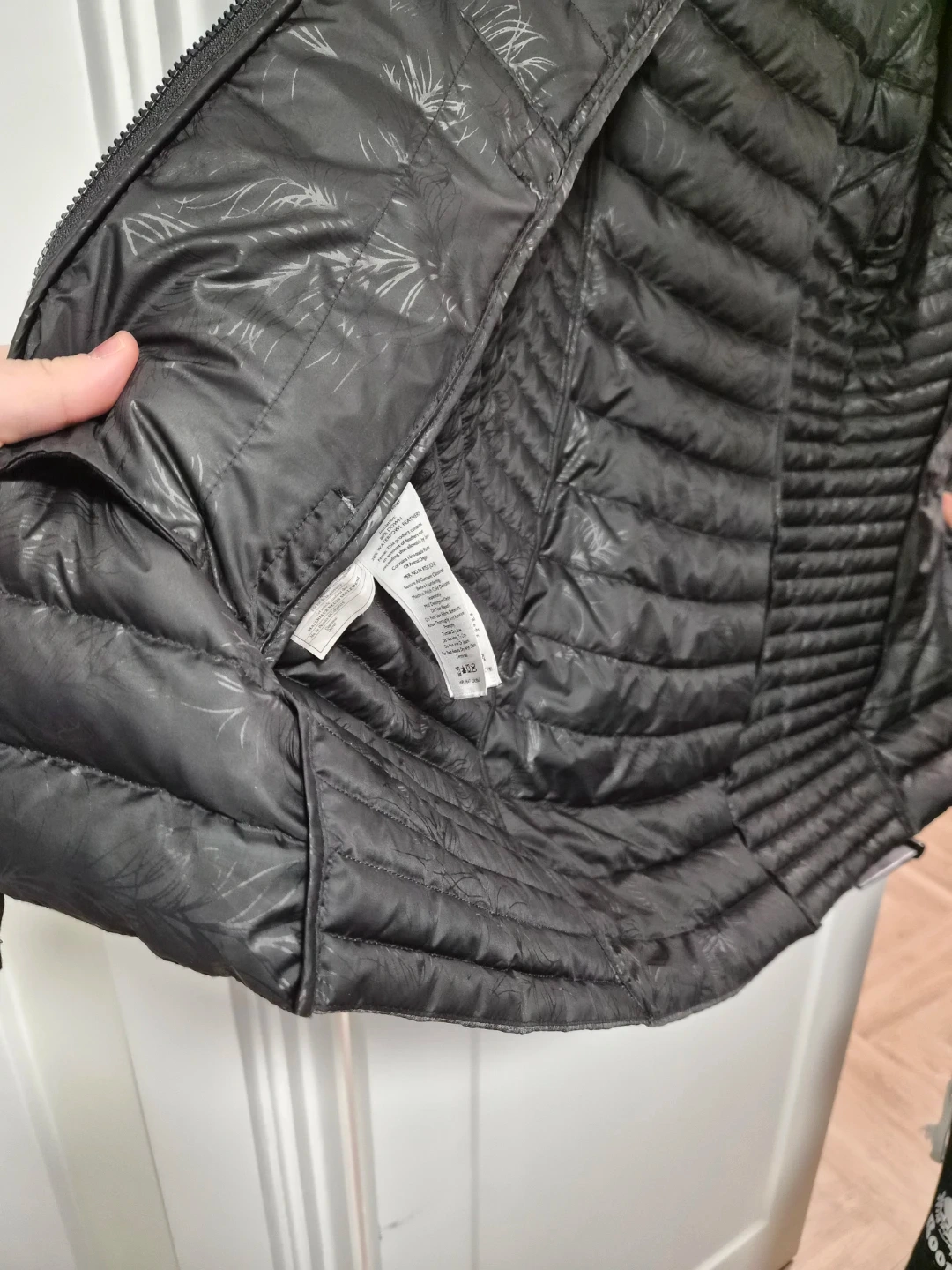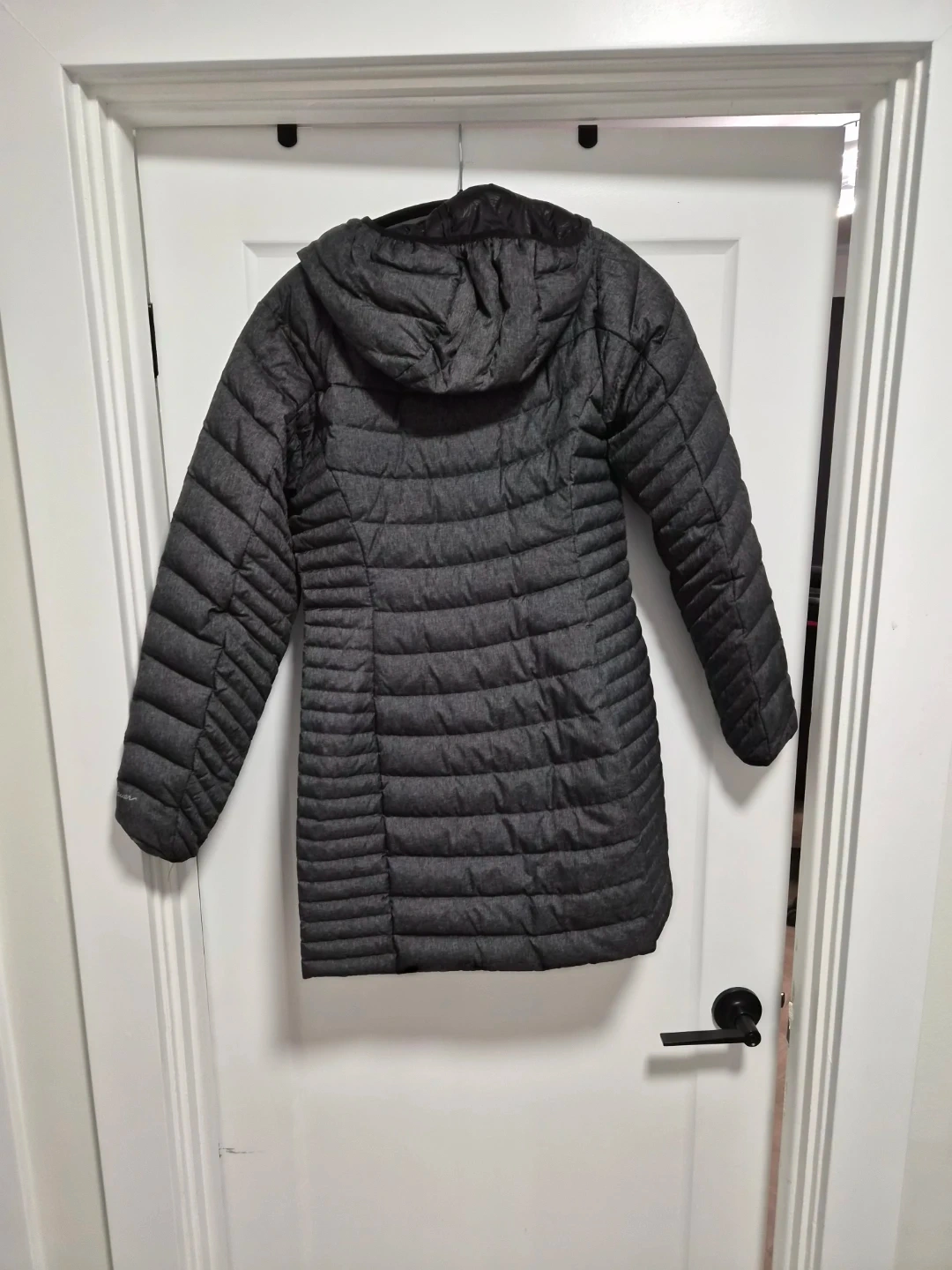 Eddie Bauer women's insulated parka. Women's size XS. It's a dark grey heathered exterior with a black quilted interior lining. It has a full zip closure and a hood.