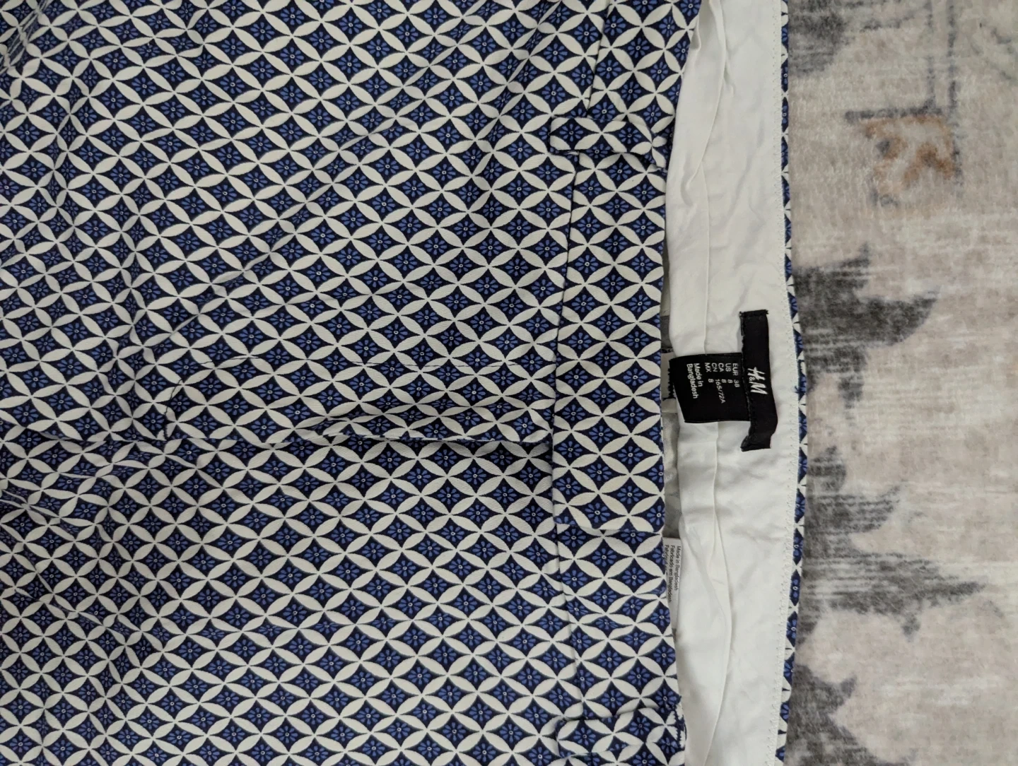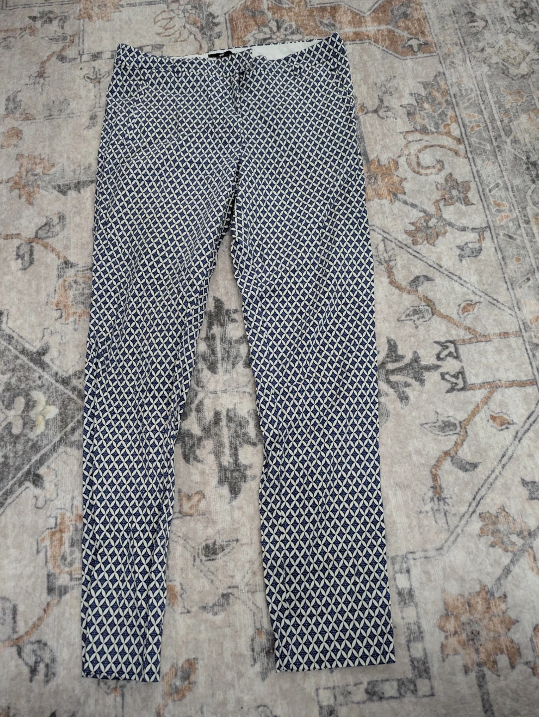 These H&M pants feature a classic navy and white geometric pattern. They're a slim fit style with a comfortable stretch fabric. The size is 10.