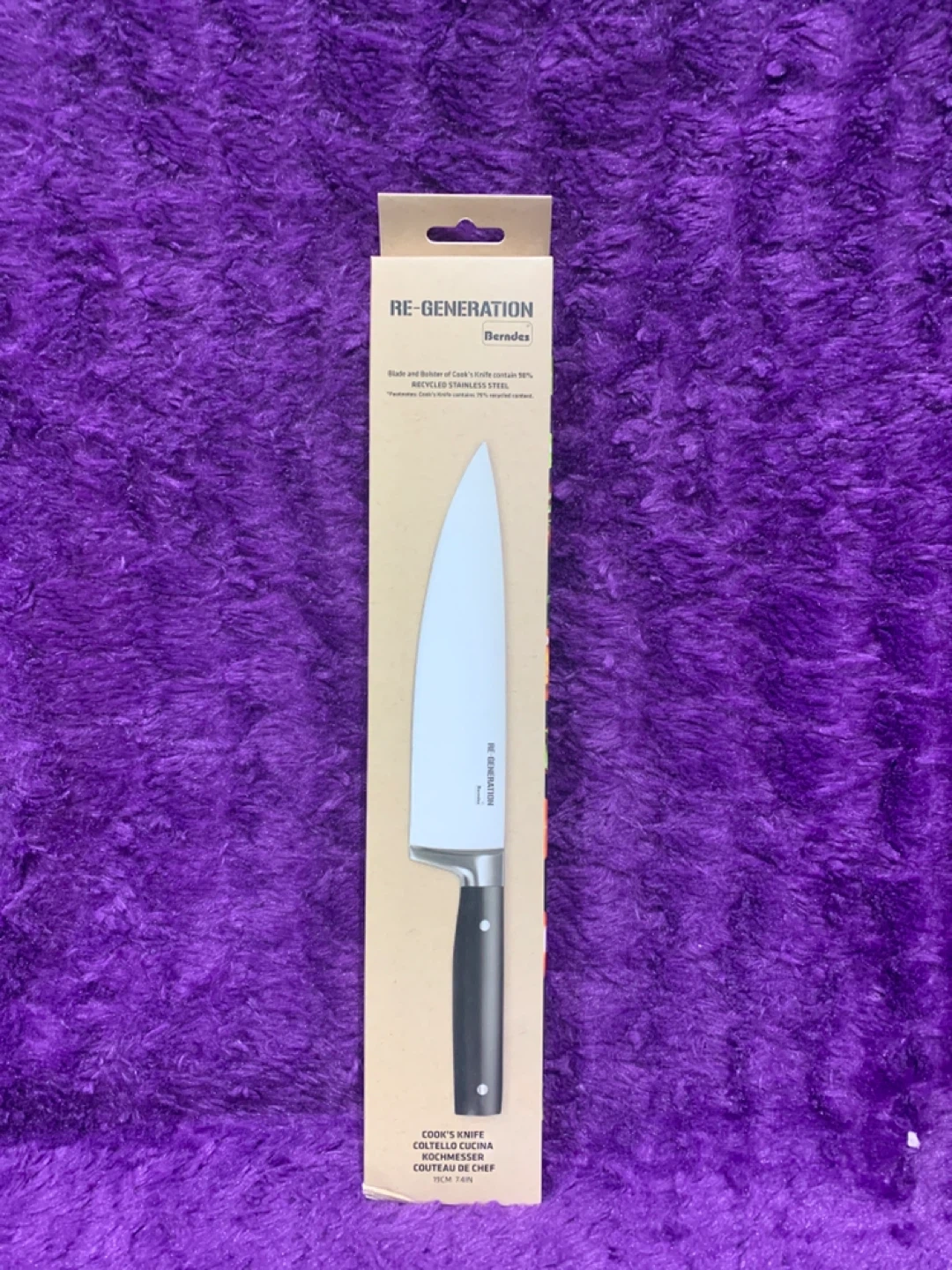 This Berndes RE-GENERATION chef's knife features a blade made from 30% recycled stainless steel. It's designed for durability and performance in the kitchen. The handle offers a comfortable grip for extended use.