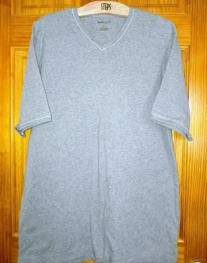 This is a men's V-neck t-shirt from Van Heusen. It's made of a soft grey material, likely cotton. The shirt has a classic V-neckline and short sleeves with white stitching details.