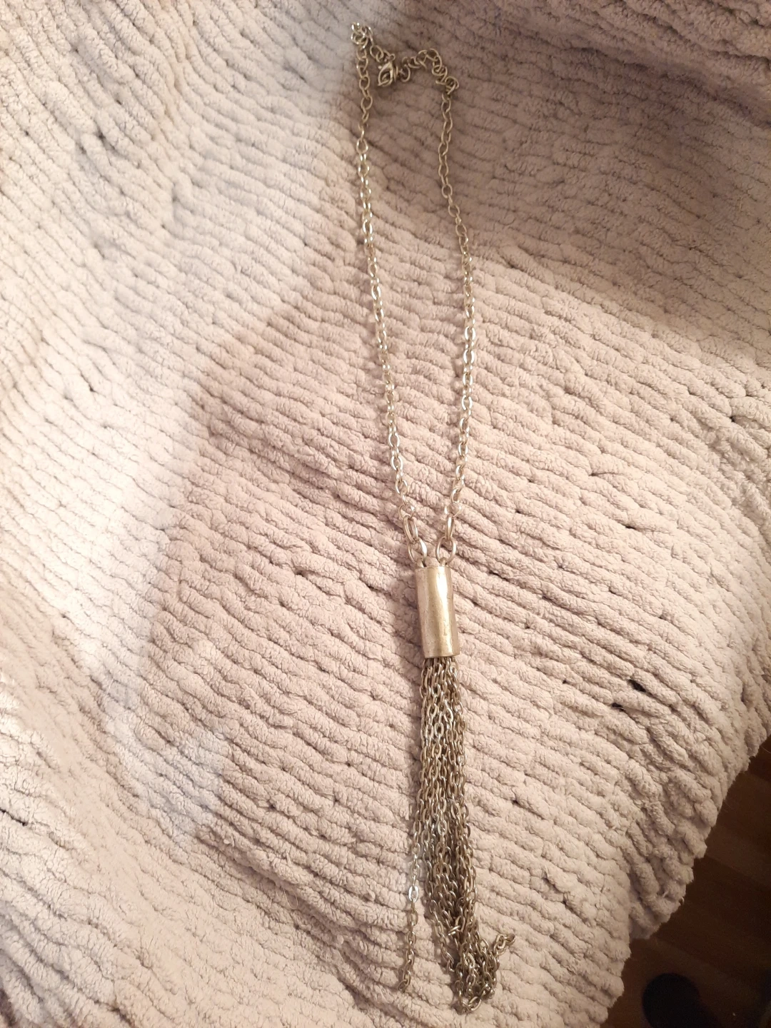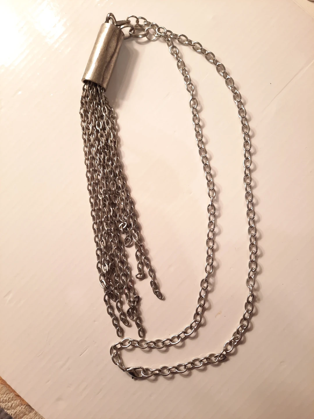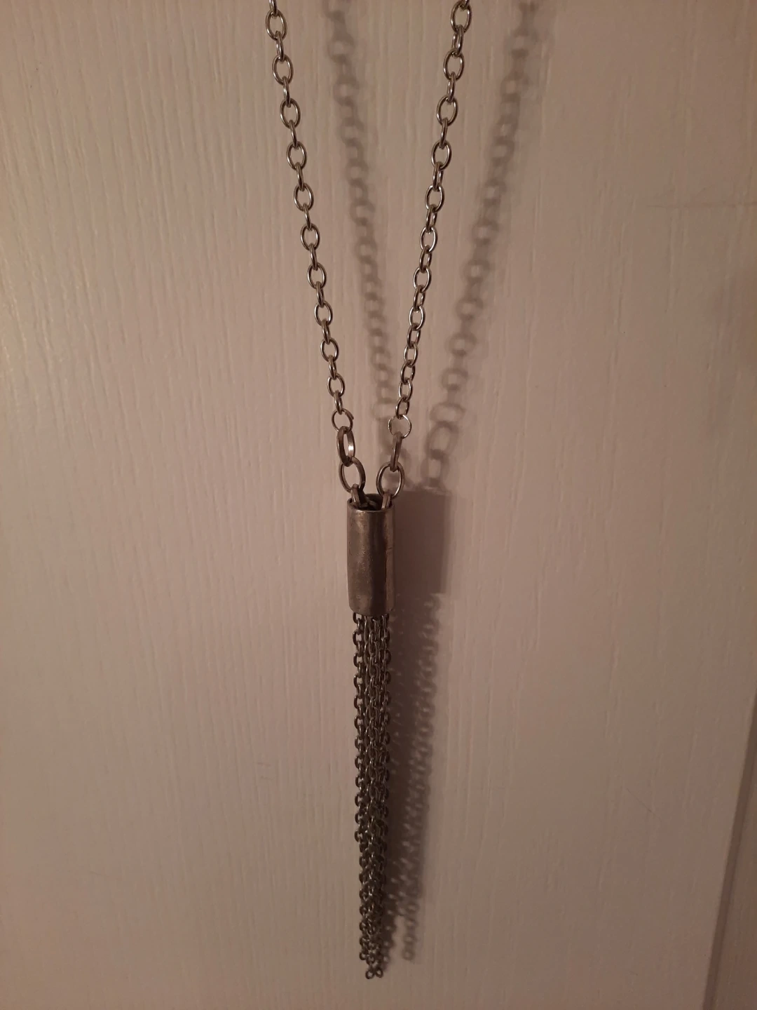 This silver-tone necklace features a long chain with a cylindrical pendant adorned with multiple dangling chains, creating a tassel effect. It's approximately 20 inches long with a 3-inch tassel drop. This piece adds a touch of bohemian flair to any outfit!not new,gently used,one of a kind ,outstanding piece.