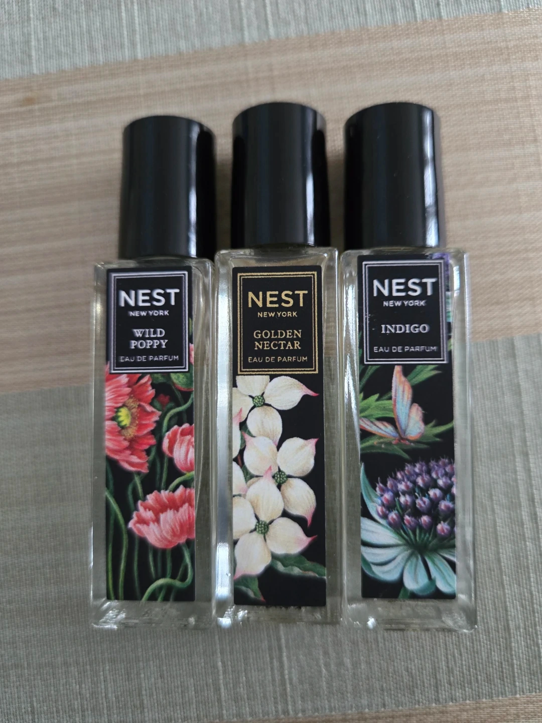 Three NEST New York Eau de Parfum fragrances are included: Wild Poppy, Golden Nectar, and Indigo. Each bottle contains perfume.