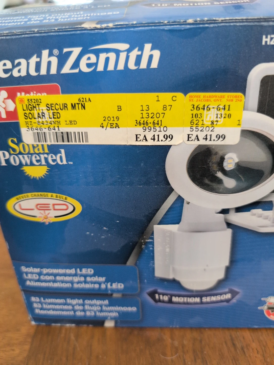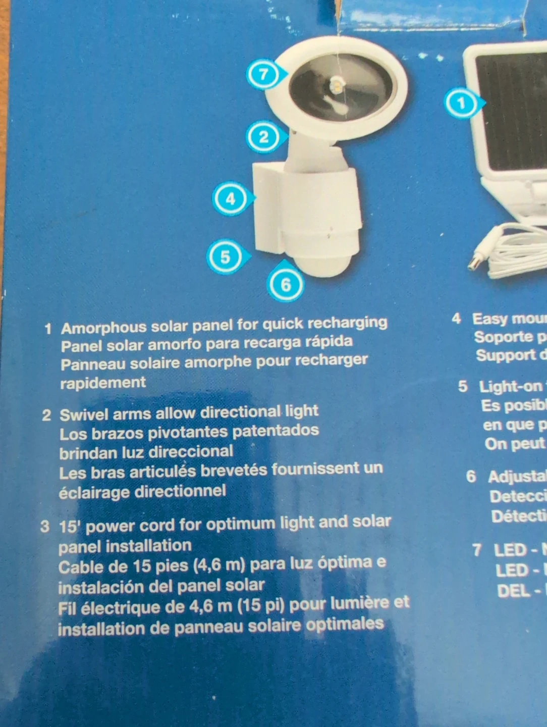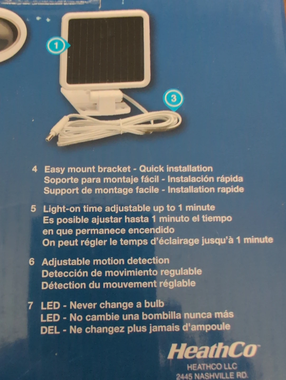 Heath Zenith motion-activated security light with an amorphous solar panel. Features adjustable motion detection and a light-on time up to 1 minute. Includes easy mount bracket and a 15' power cord. It's LED and never needs a bulb change!
