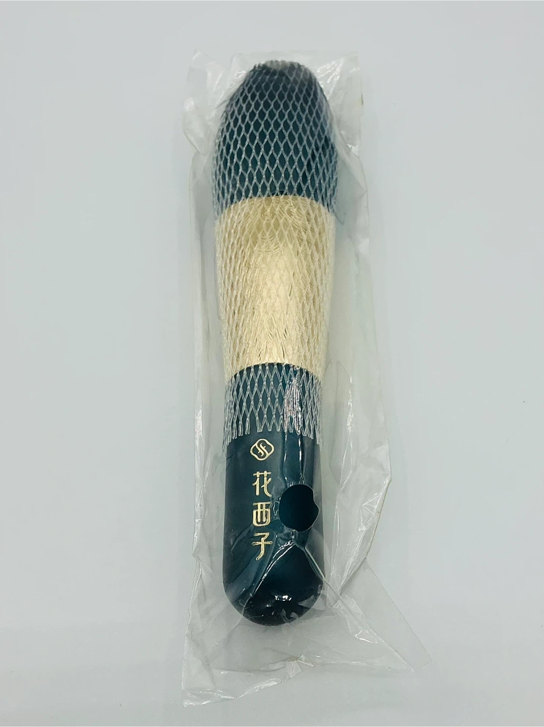 A new makeup brush. The handle is dark satin teal with gold. The bristles are densely packed and very soft for smooth application.