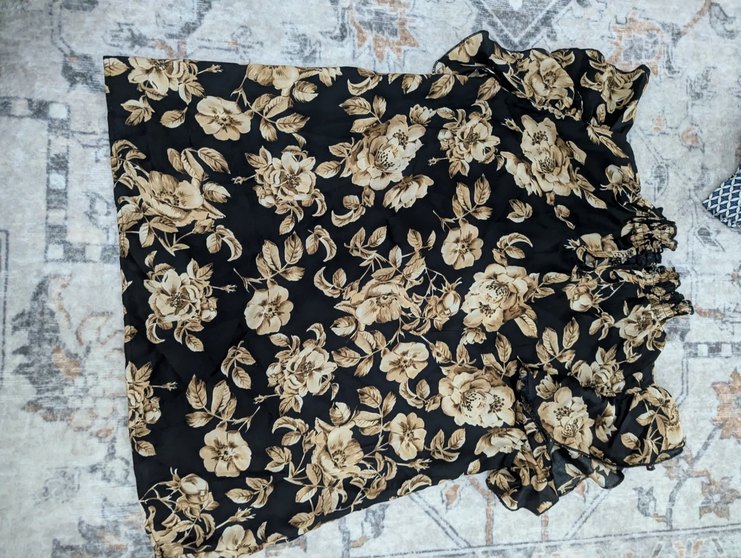A lovely black maxi skirt with a beige floral print. It features a gathered elastic waistband for comfort. The flowy design makes it a great option for warmer weather! Large