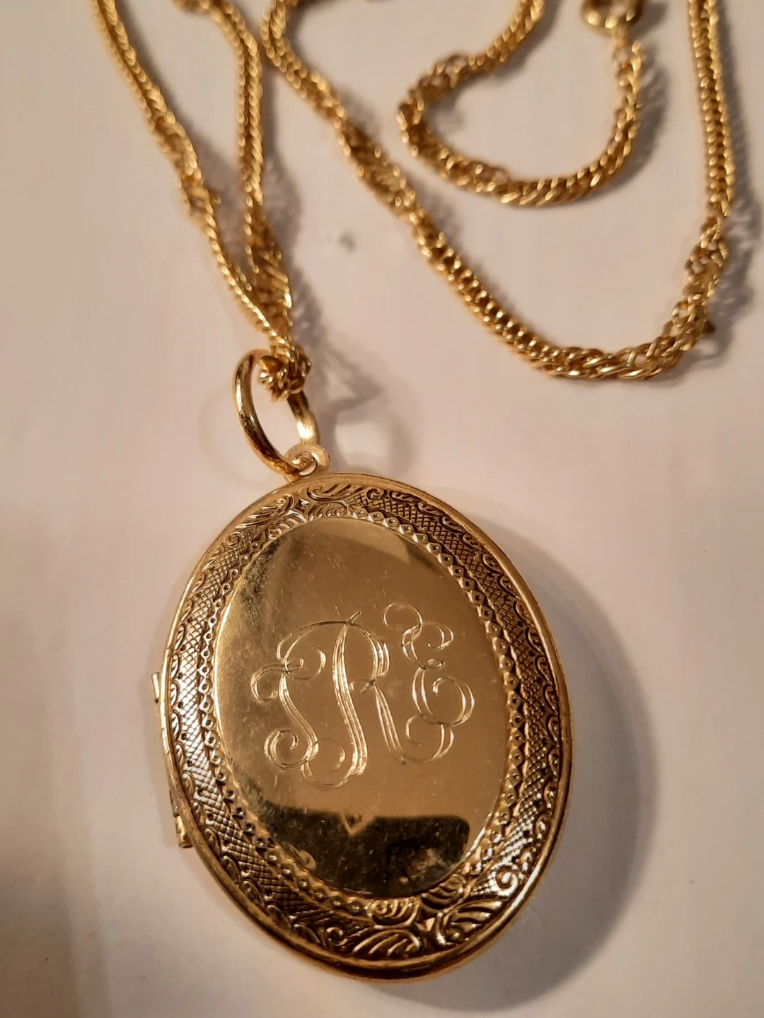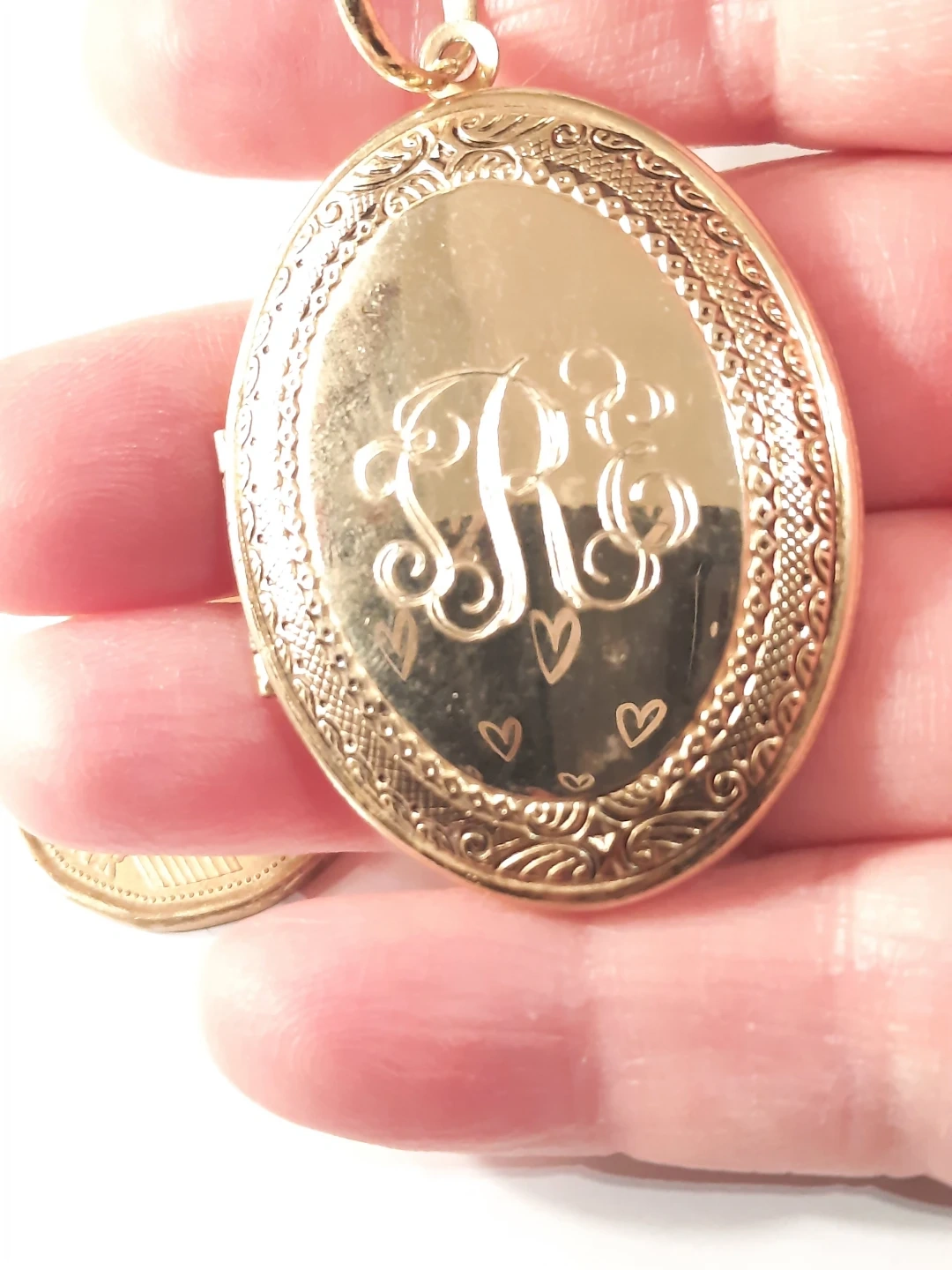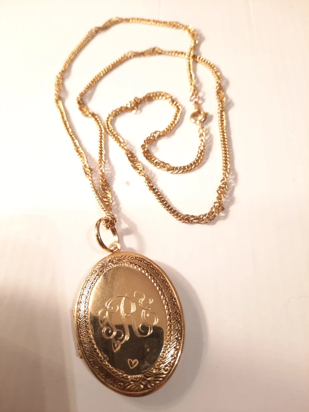 A beautiful oval locket necklace with a gold tone finish. It features an ornate embossed border and a monogram in the front. The locket opens to hold photos. A classic piece to add to any jewellery collection!large locket.
