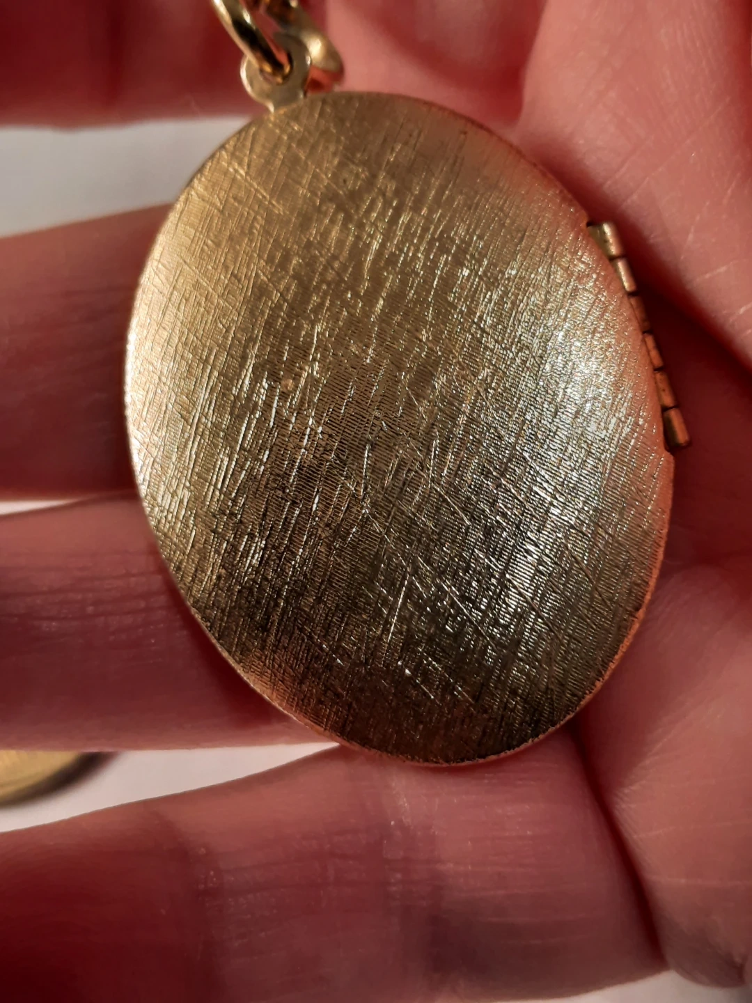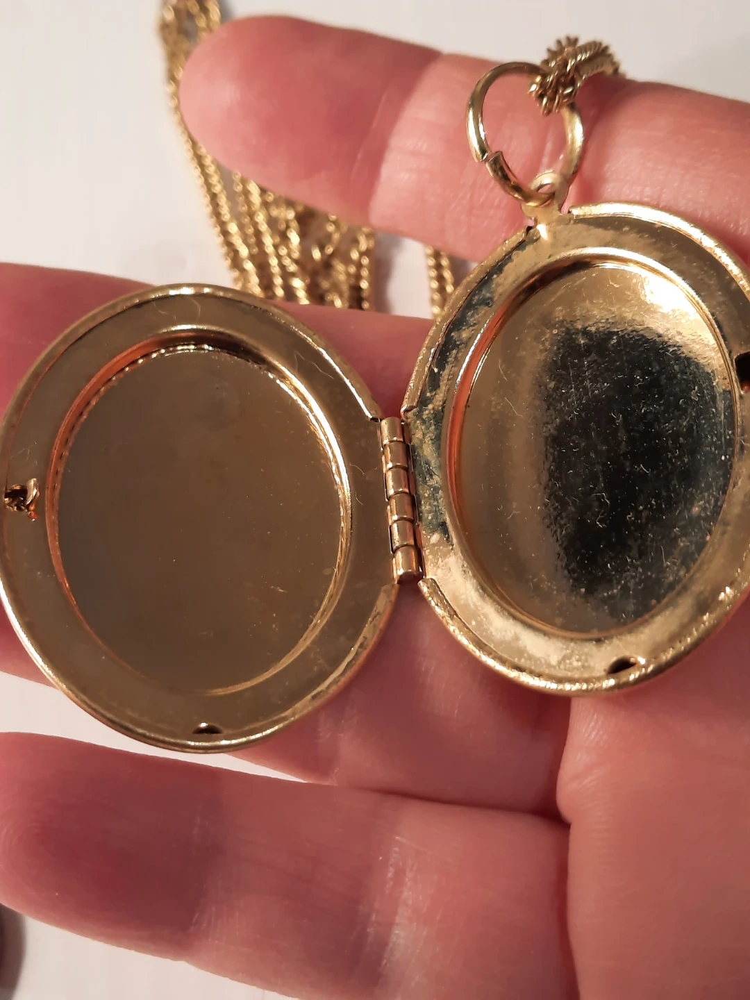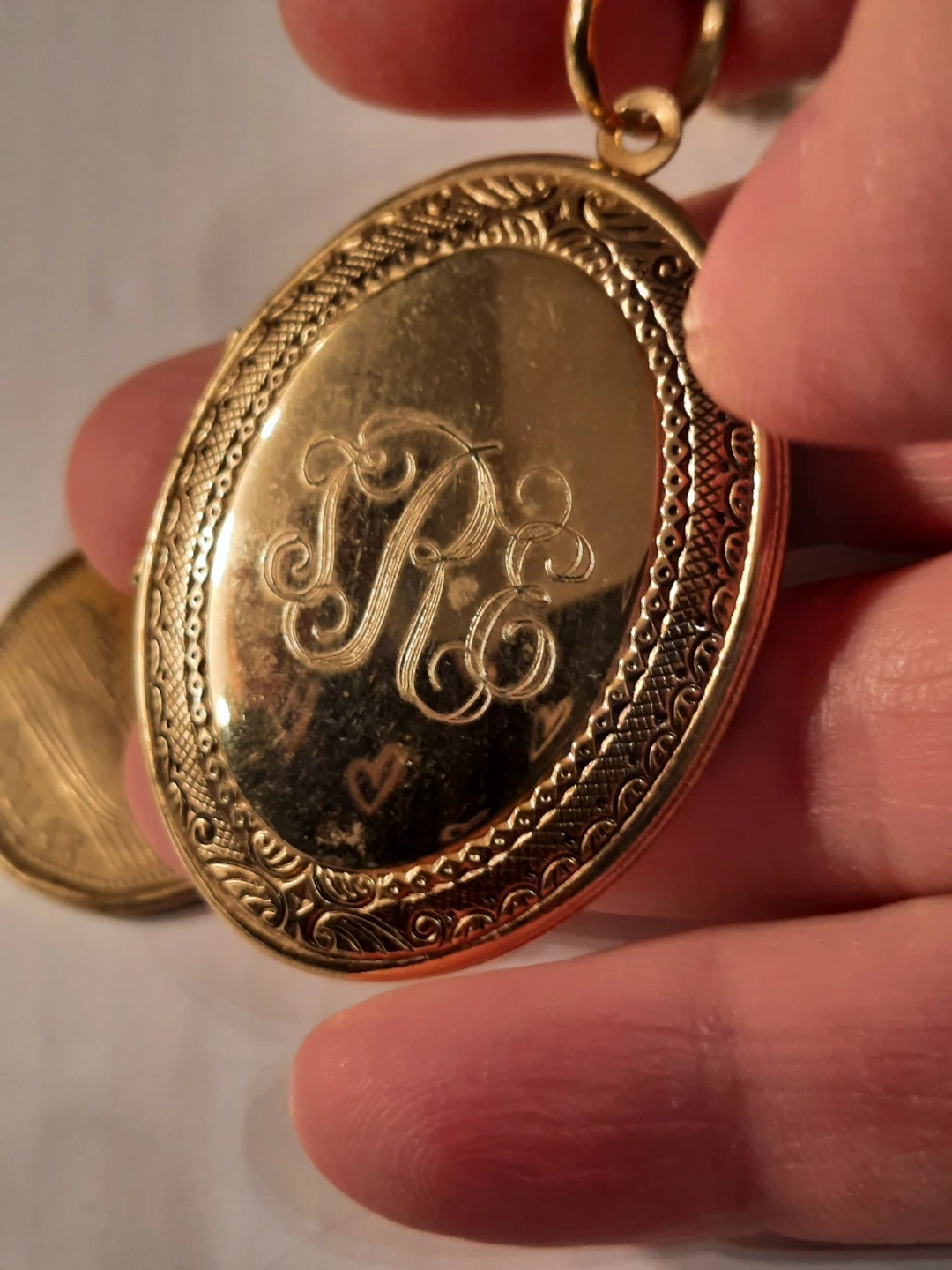 A beautiful oval locket necklace with a gold tone finish. It features an ornate embossed border and a monogram in the front. The locket opens to hold photos. A classic piece to add to any jewellery collection!large locket.