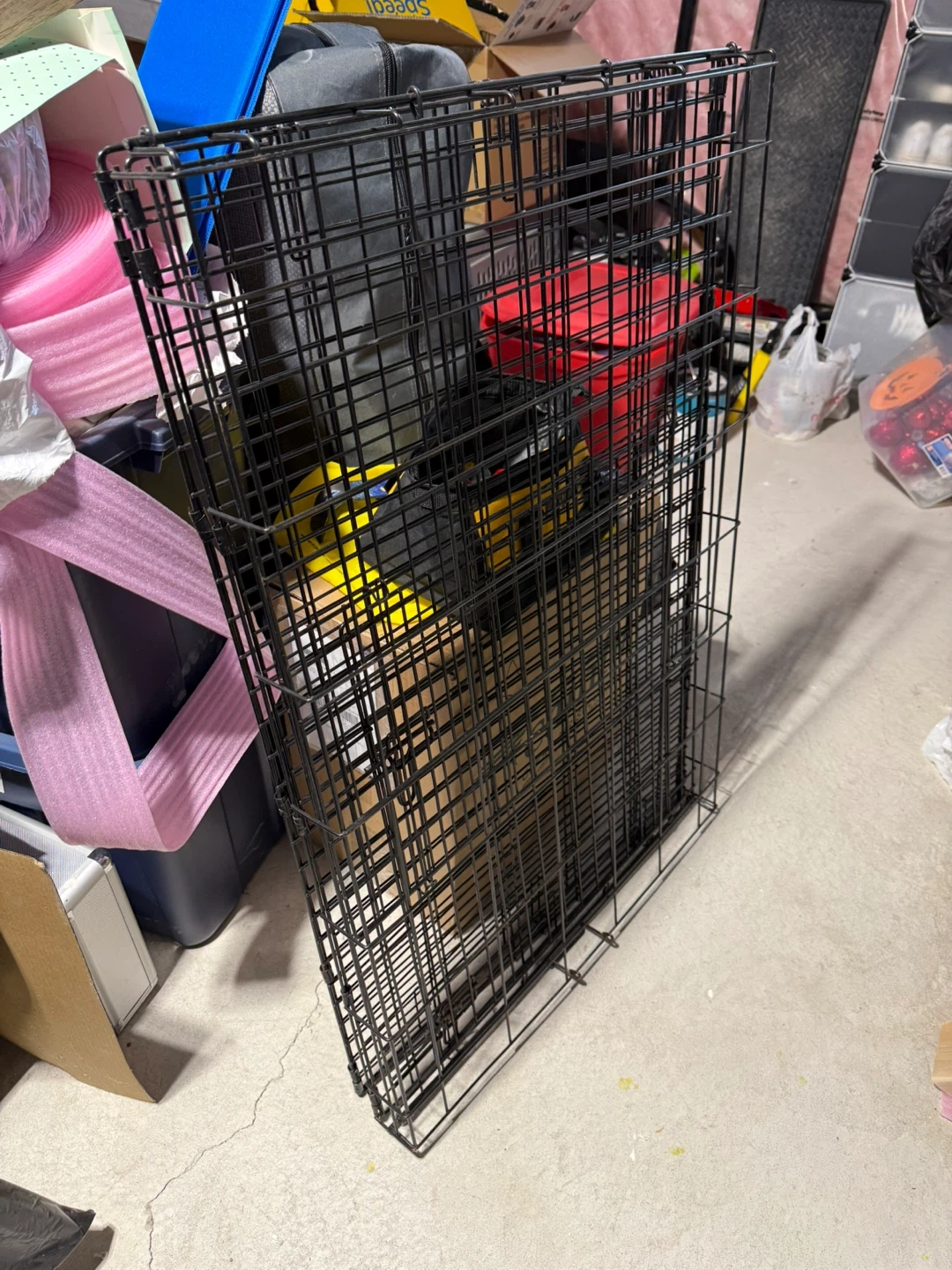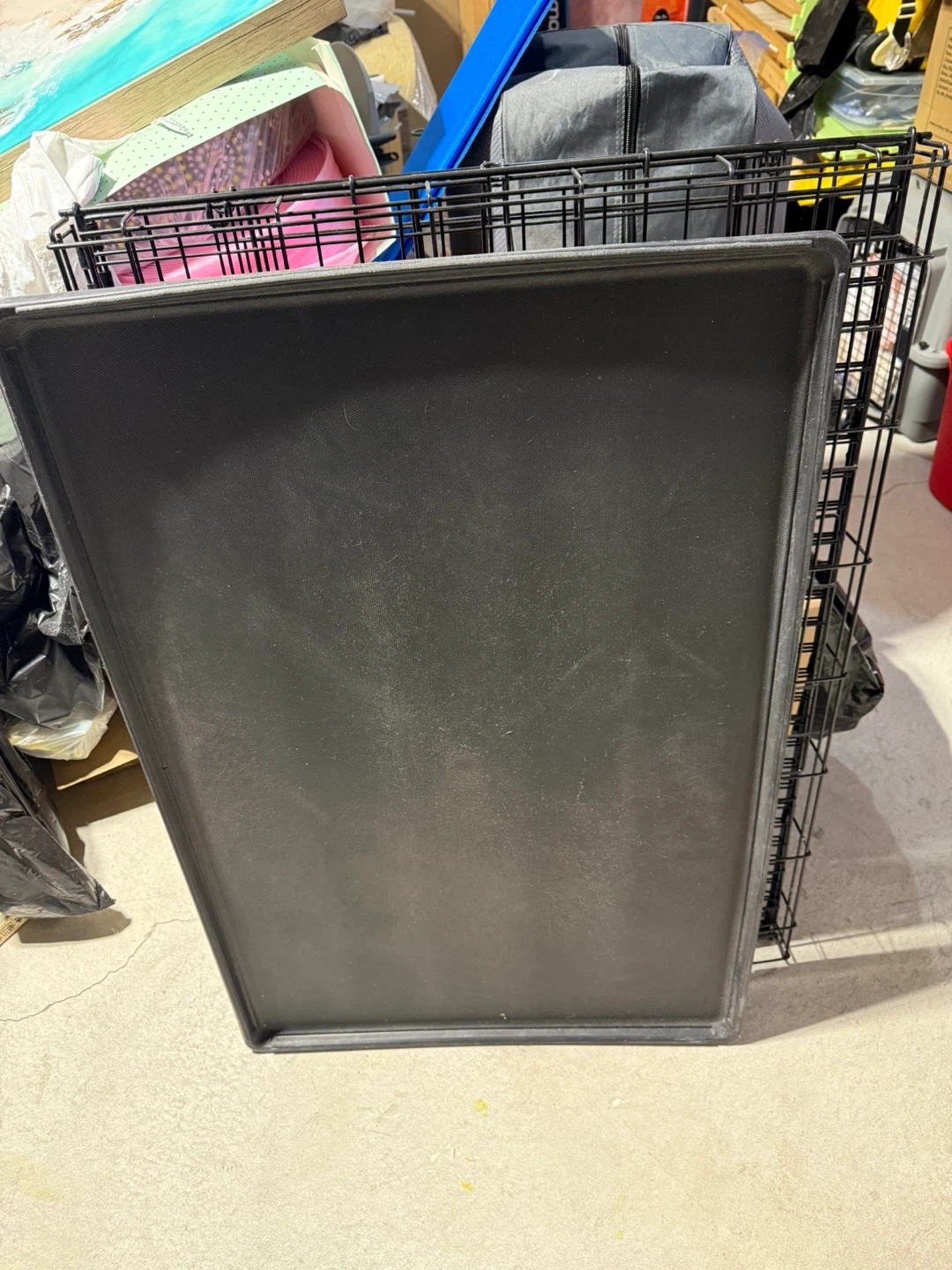 Wire dog crate for pets. Includes a black plastic tray insert. This crate provides a safe space for your furry friend. Dimensions are approximately