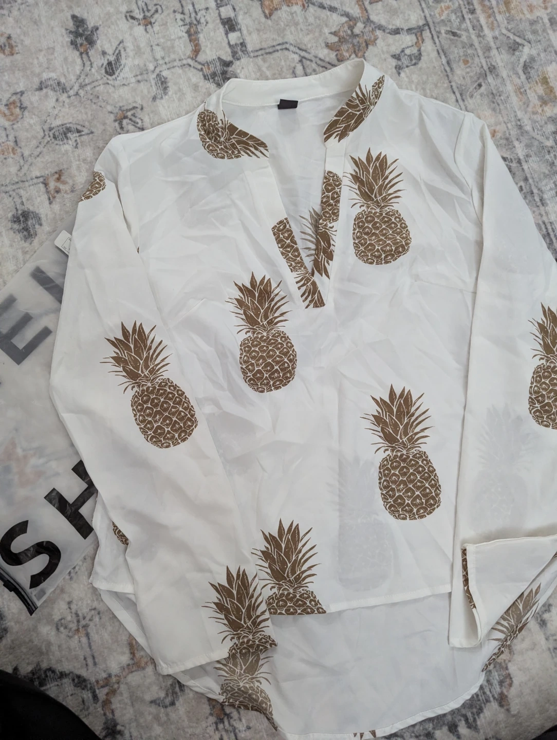 Cute white blouse from SHEIN with a fun all-over pineapple print. It's a size medium (US 6) and made in China. This top is lightweight and perfect for warmer weather!