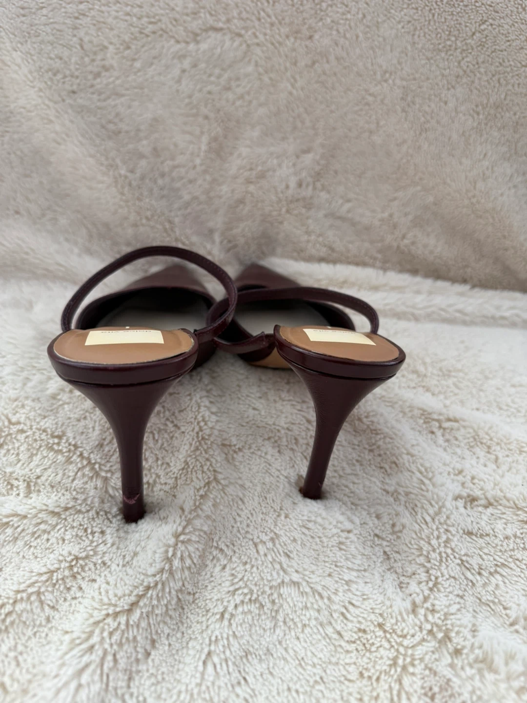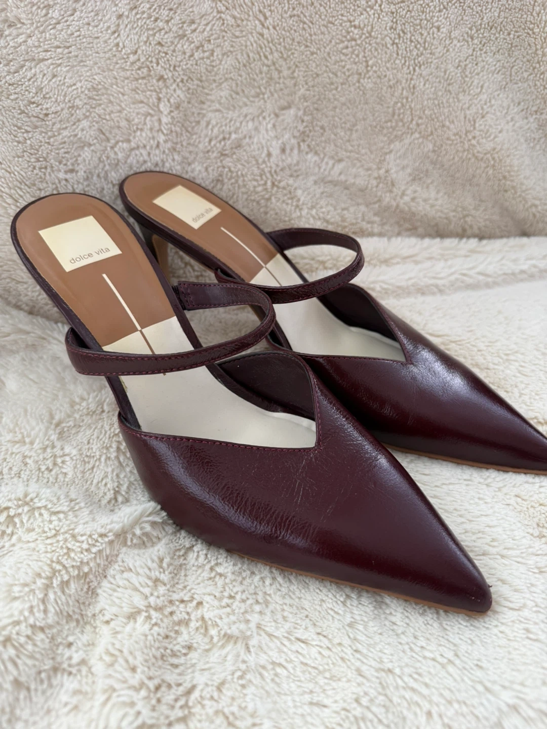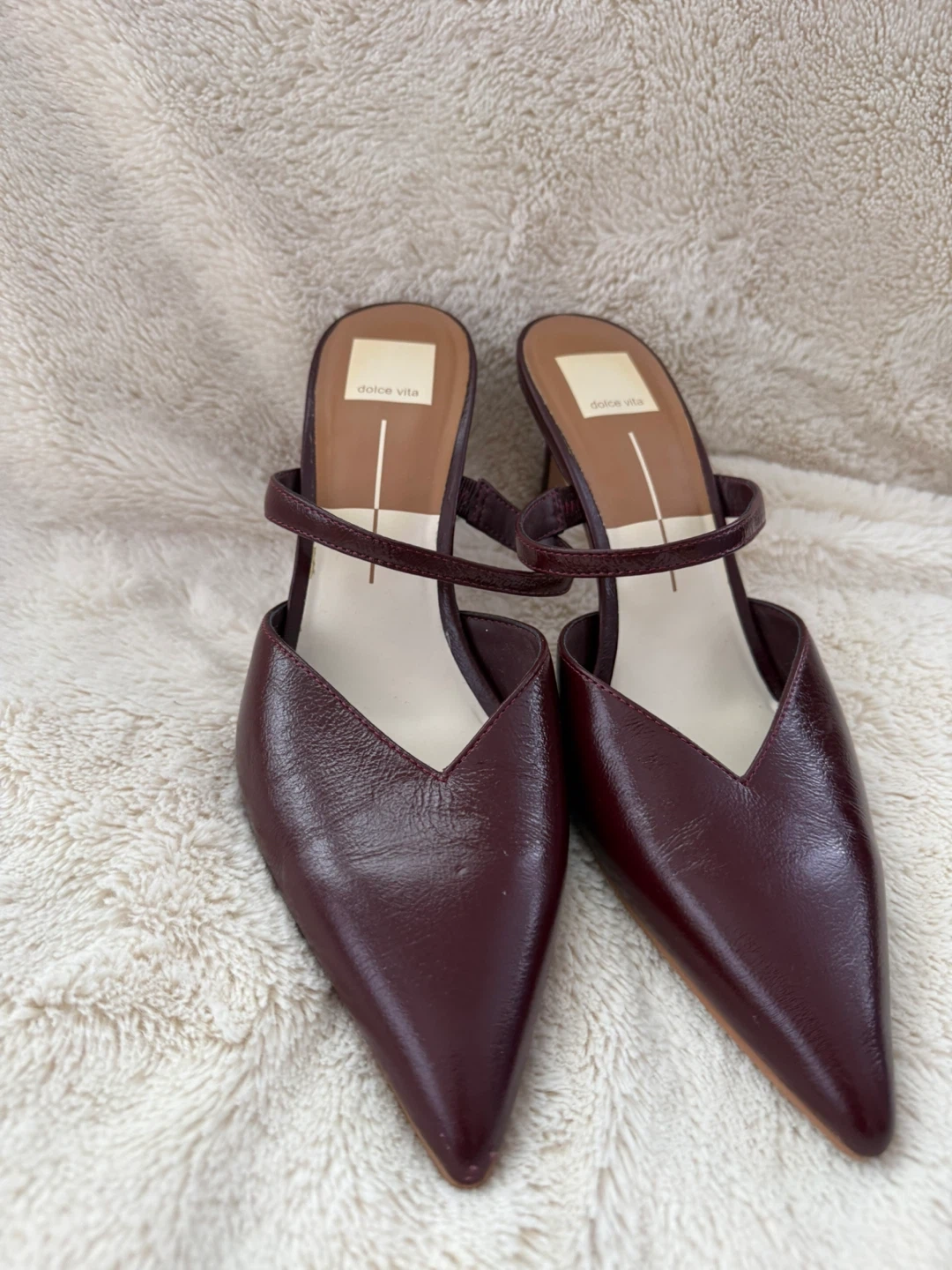 These Dolce Vita mules are a deep burgundy colour. They feature a pointed toe and a strap across the heel. The exterior appears to be leather with a glossy finish. Heel height is approximately 2.5 inches.