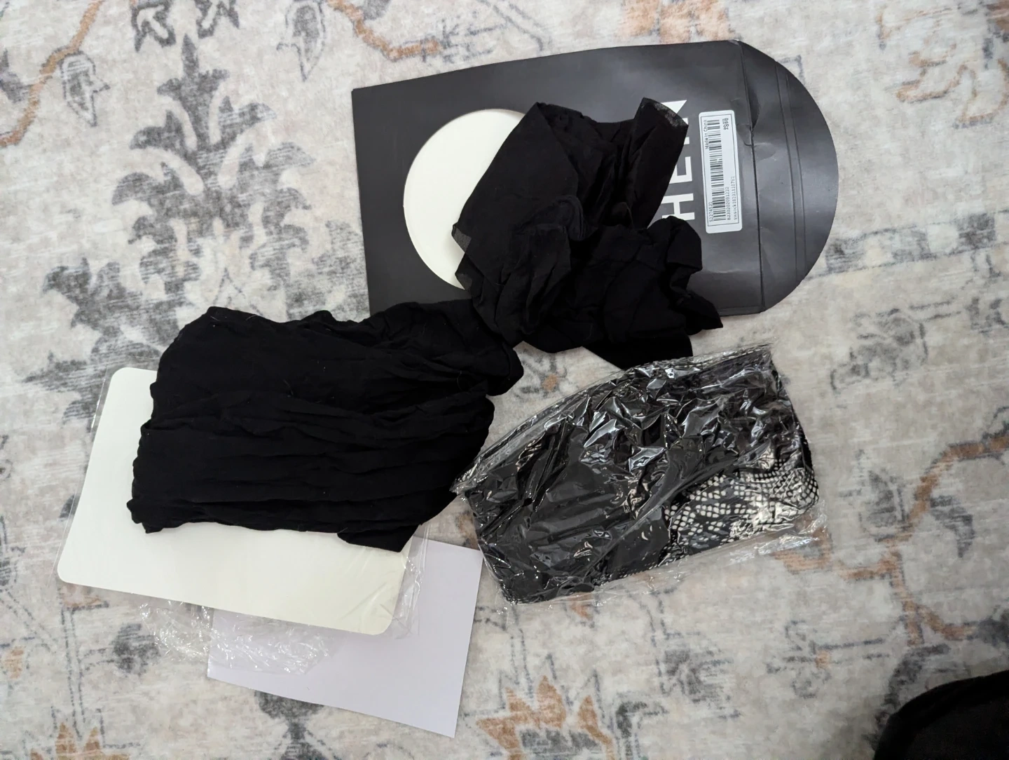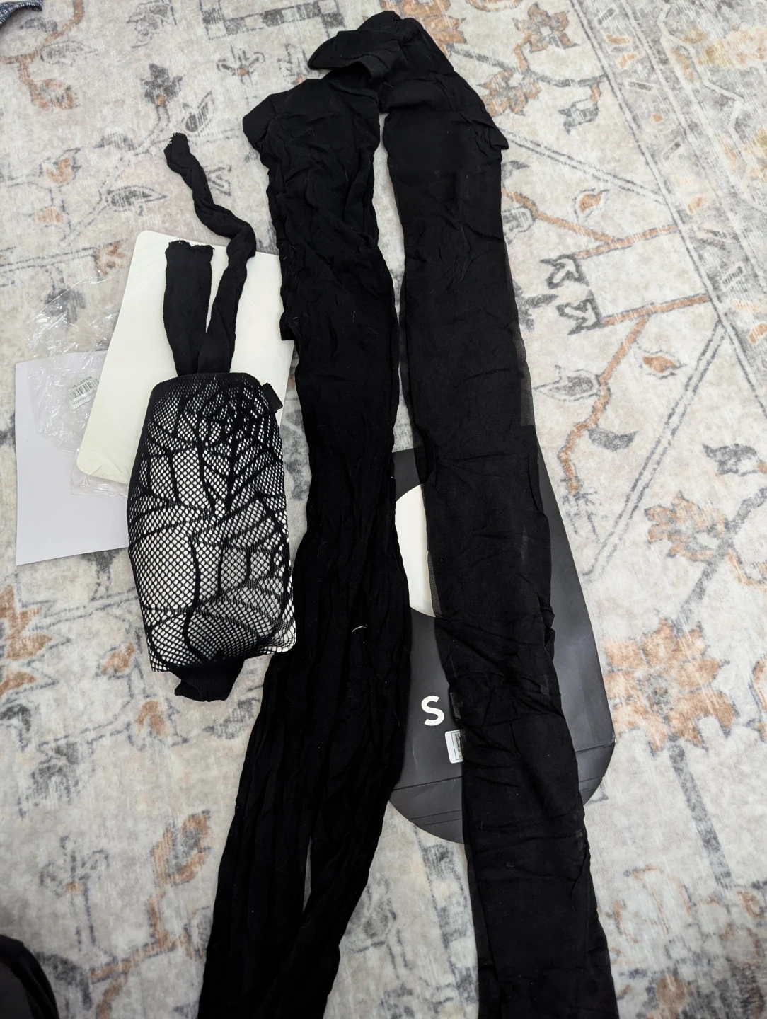 Includes a pair of black tights and a pair of fishnet stockings. Both items are black. Perfect for completing an outfit or for special occasions!