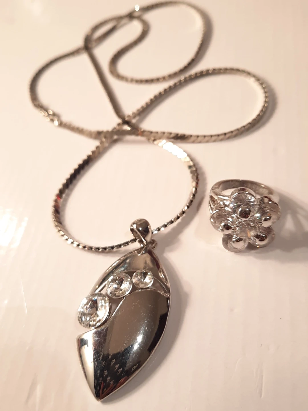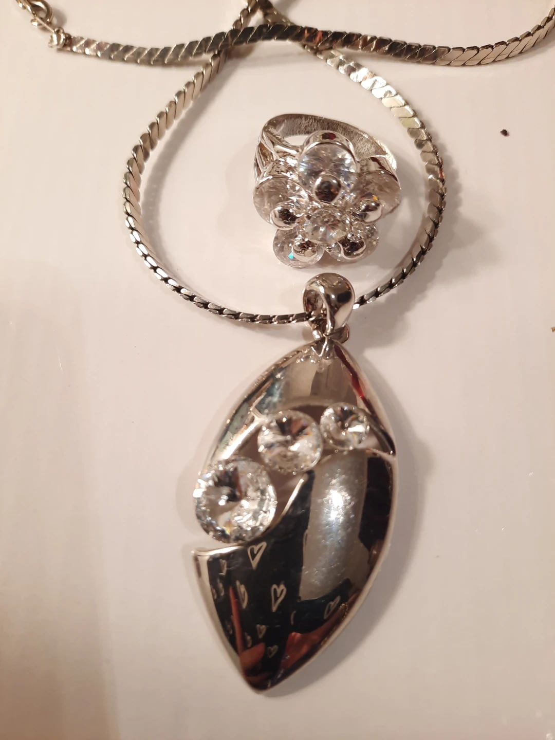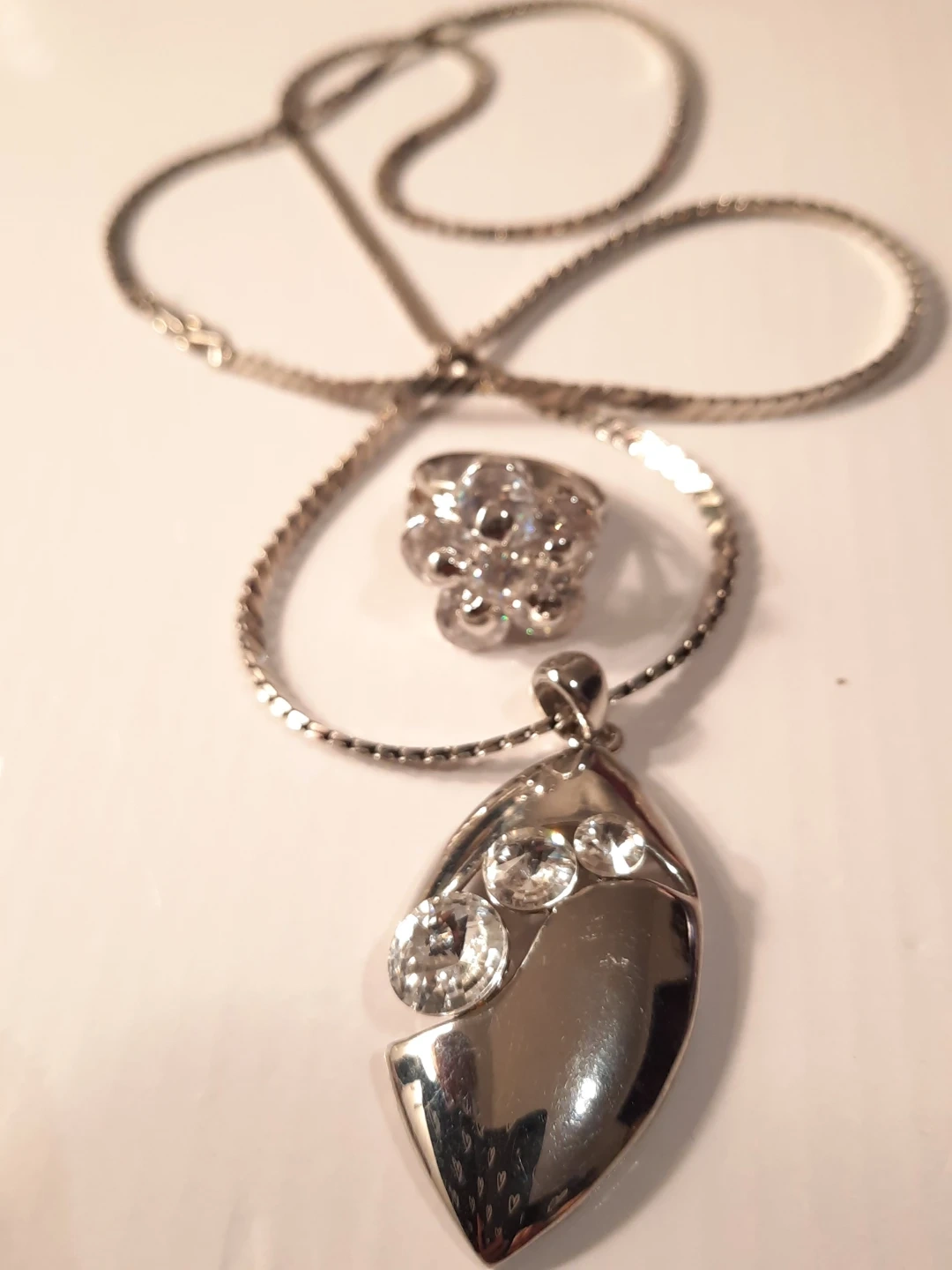This set includes a silver-tone chain stainless steel necklace with a teardrop pendant adorned with clear stones, and a matching ring.18k gold plate stamped inside band outside look great the ring inside band show some minimal ware The pendant measures approximately 5cm long. The ring's band is about 7mm wide and it appears to fit a size 7 finger. It's a lovely combo for adding a bit of sparkle!