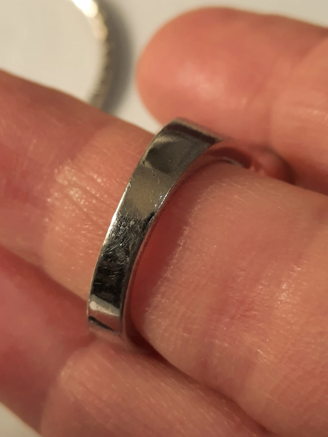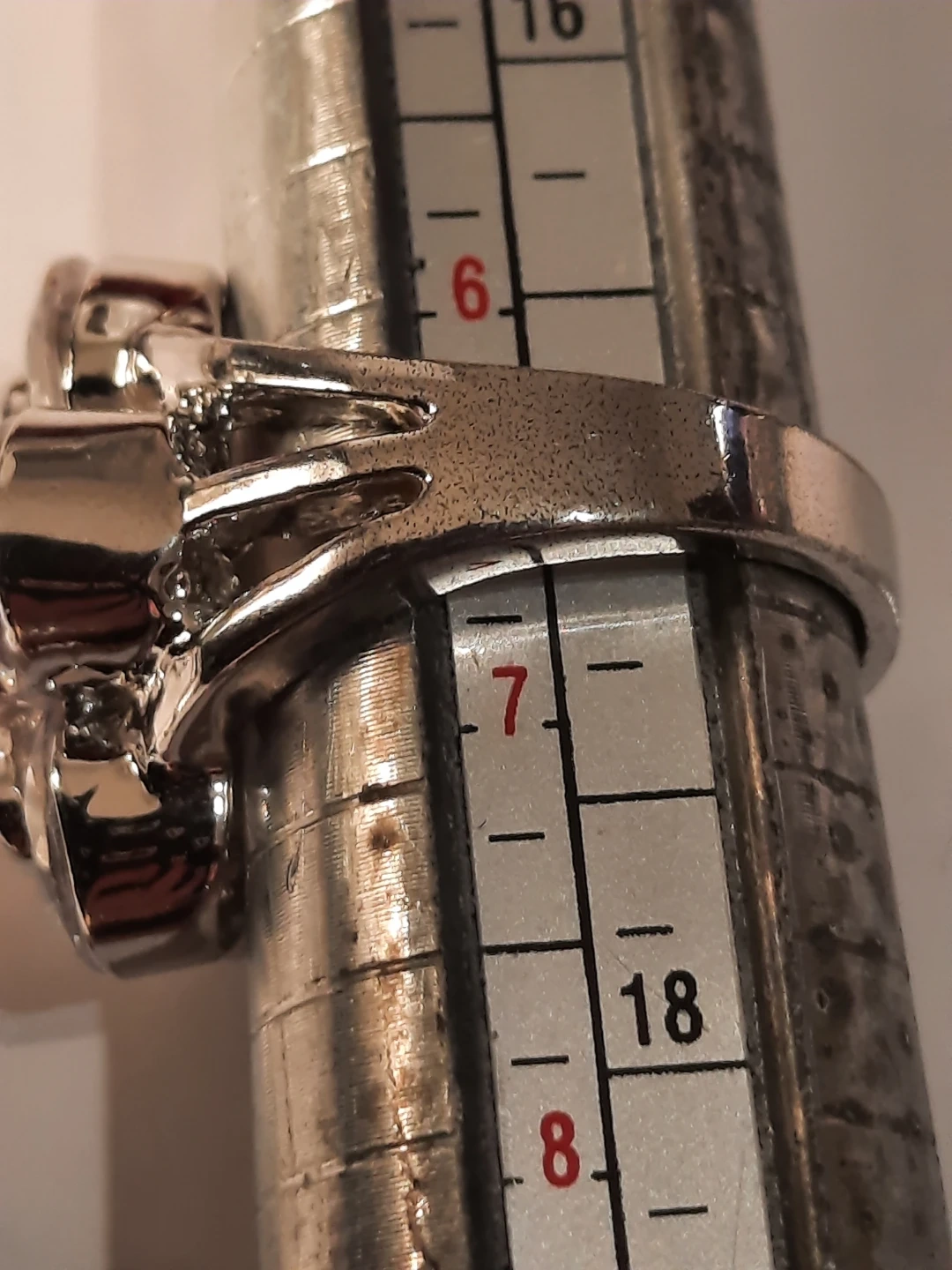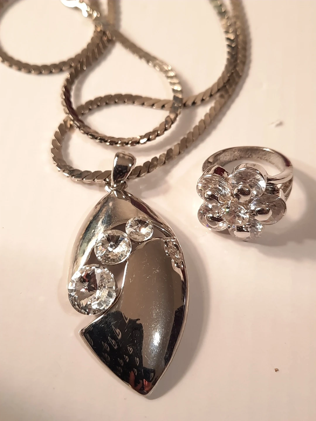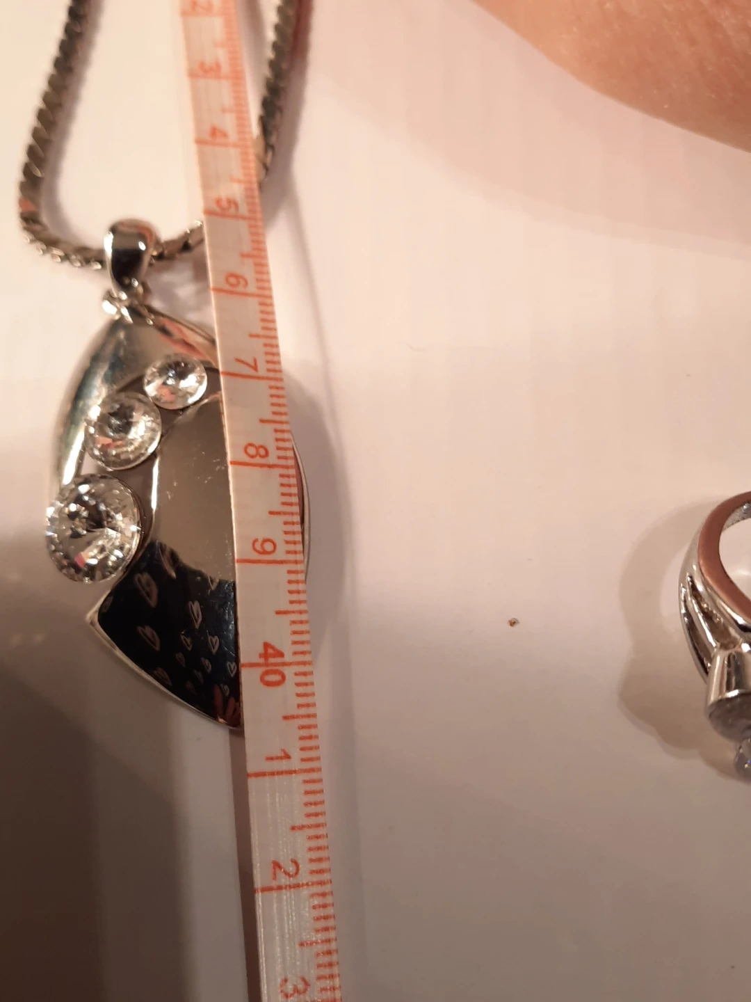 This set includes a silver-tone chain stainless steel necklace with a teardrop pendant adorned with clear stones, and a matching ring.18k gold plate stamped inside band outside look great the ring inside band show some minimal ware The pendant measures approximately 5cm long. The ring's band is about 7mm wide and it appears to fit a size 7 finger. It's a lovely combo for adding a bit of sparkle!