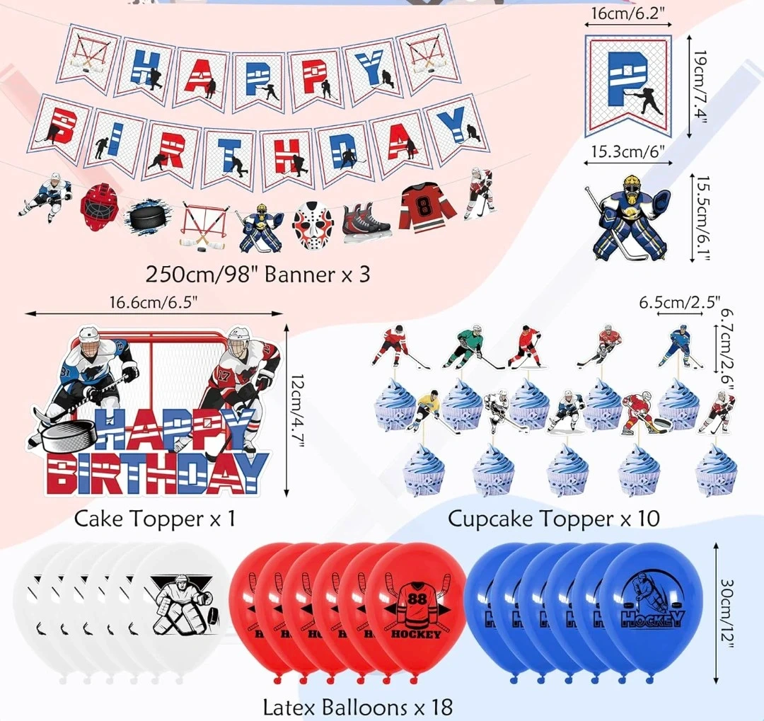 This hockey-themed party decoration set includes three 250cm banners and a cake topper. It also comes with 10 cupcake toppers and 18 latex balloons in red and blue, all featuring hockey graphics. Great for a birthday celebration!