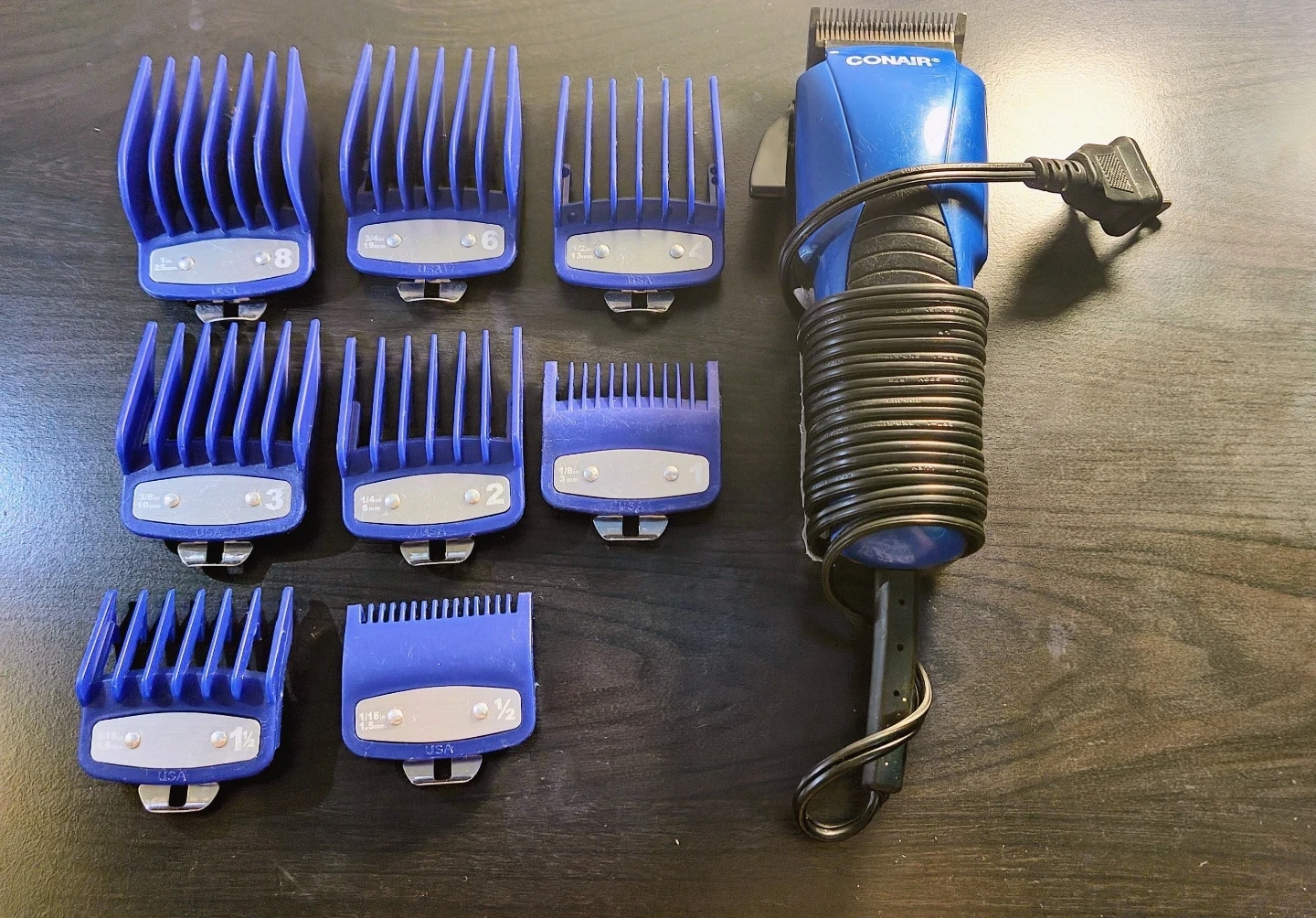 This set includes a blue Conair electric hair clipper and eight different attachment combs. The combs range in size from 1/2 to 8 . This kit is great for home haircuts and touch-ups!