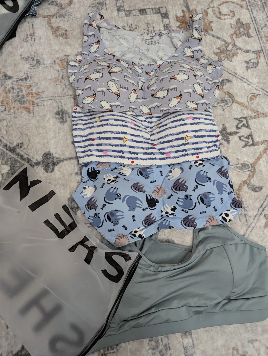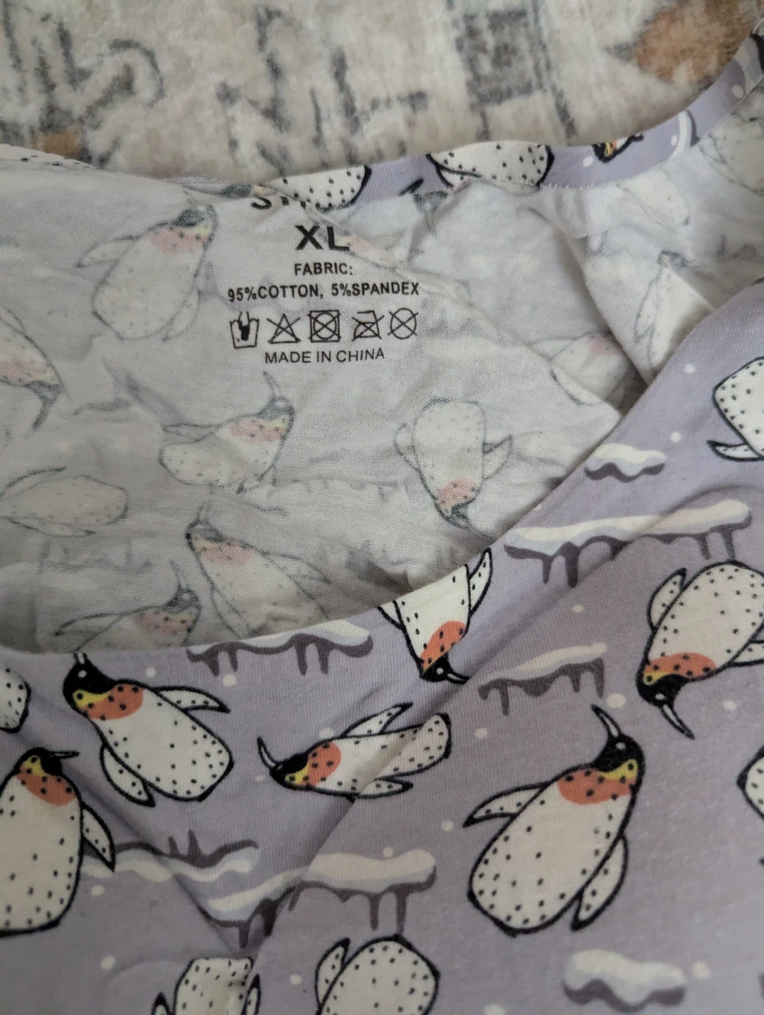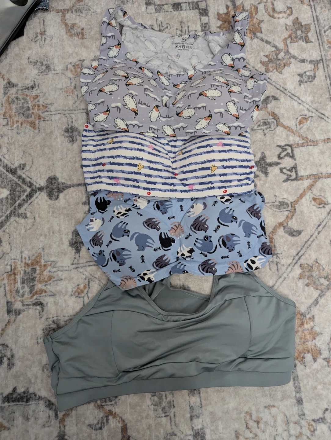 Four women's pajama tank tops with cute prints. Includes penguin, striped, and cat designs. Fabric is 95% cotton and 5% spandex.