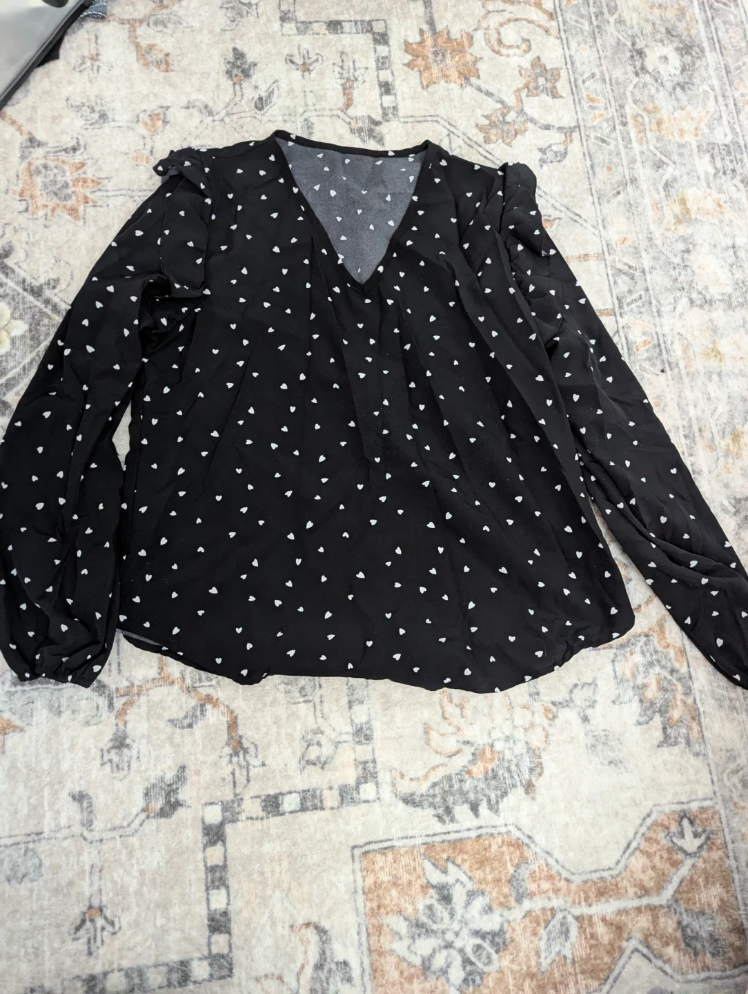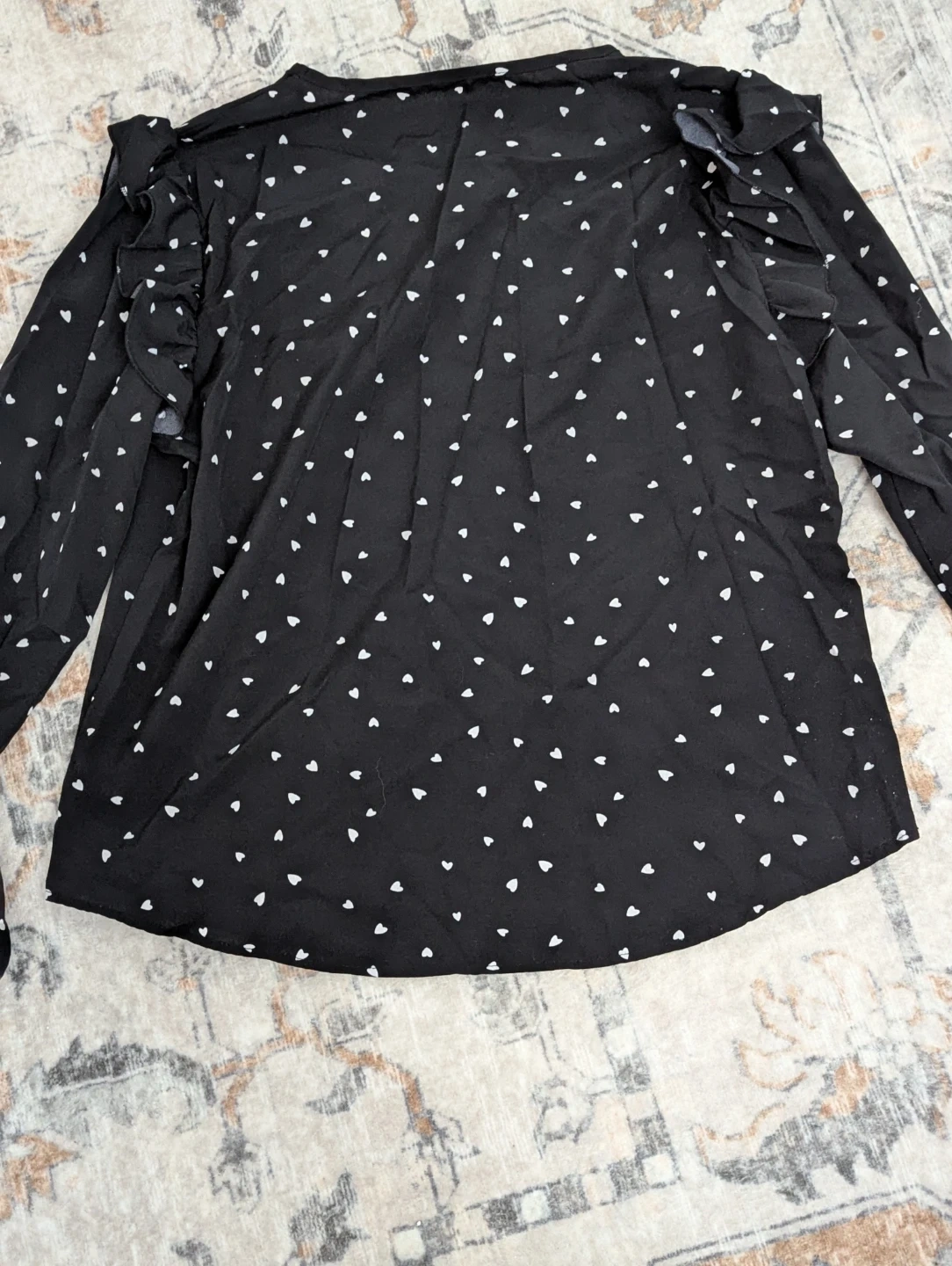 This black blouse has a V-neck and long sleeves with ruffled details on the shoulders. It's covered in a small white heart pattern. The fabric is lightweight and flowy.