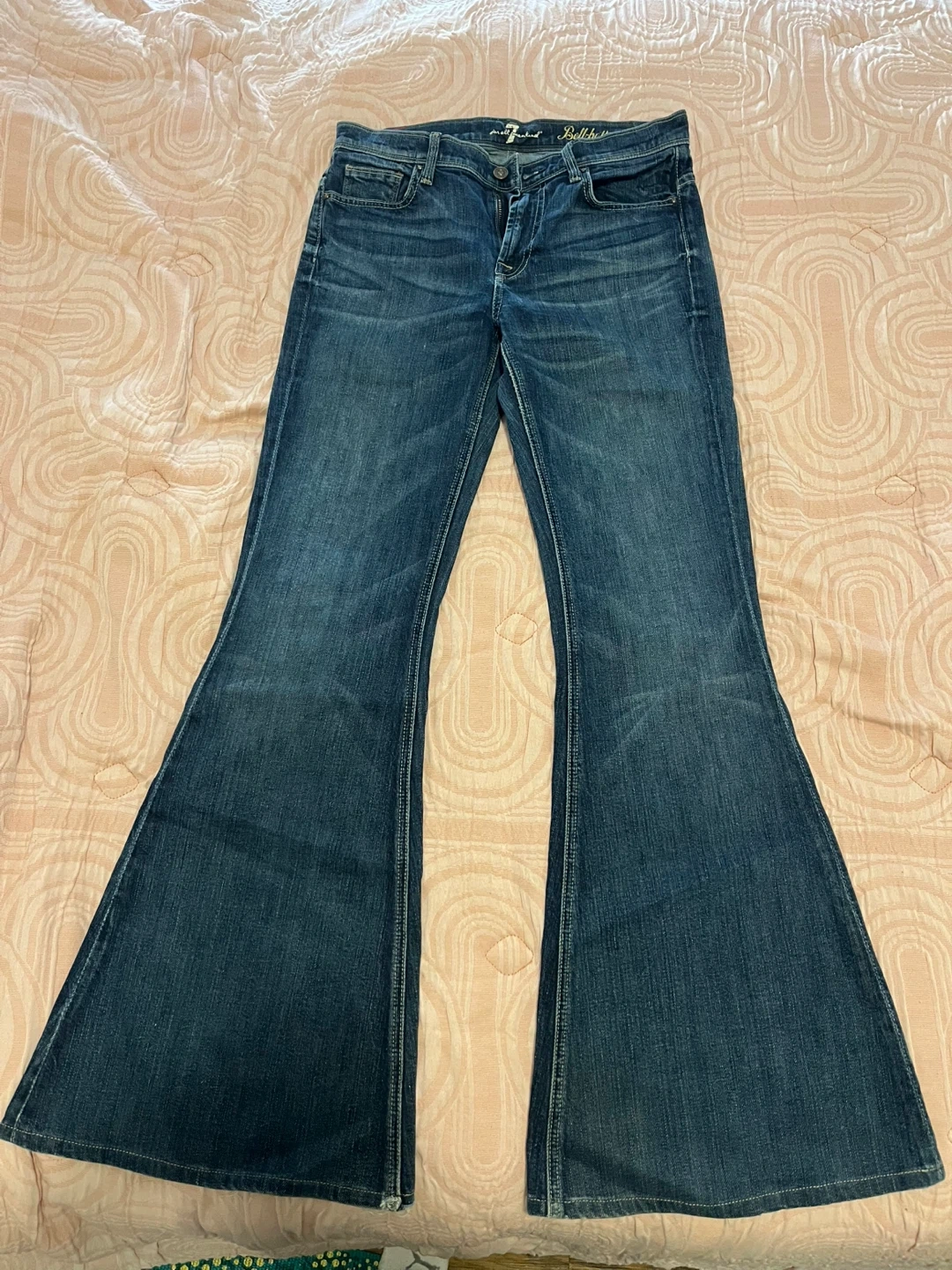 These 7 For All Mankind jeans feature a classic blue wash and a flared bell bottom silhouette. They're made from durable denim. A great addition to any casual wardrobe!