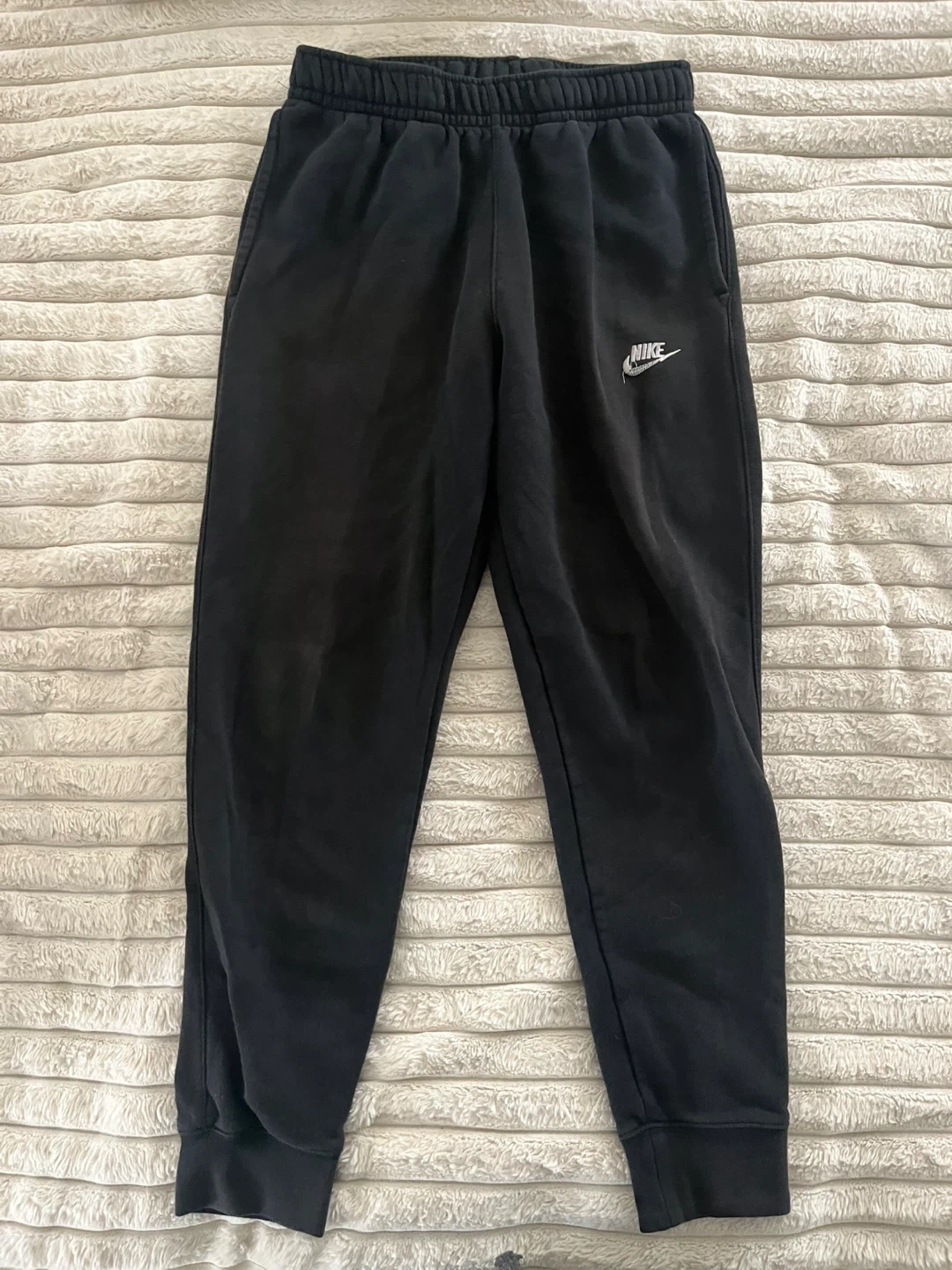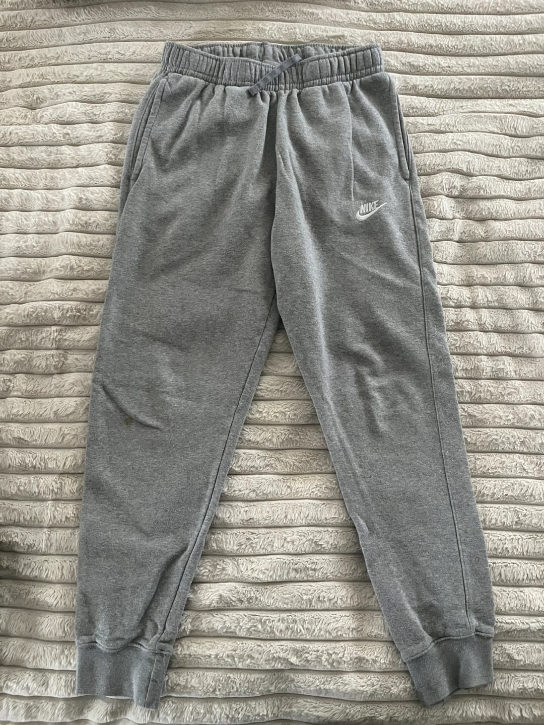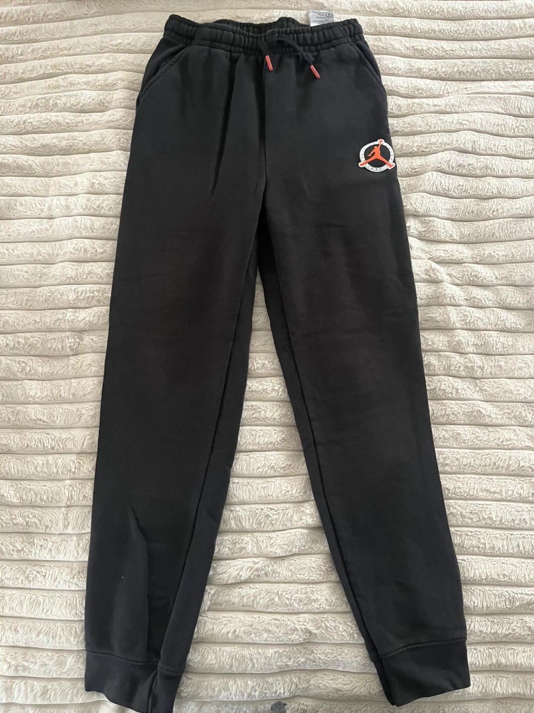 Bundle includes Nike and Jordan brand youth athletic pants. Features elastic waistbands with drawstring closures and cuffed ankles. Available in black, navy, and grey colours. Size youth XL or adult small.