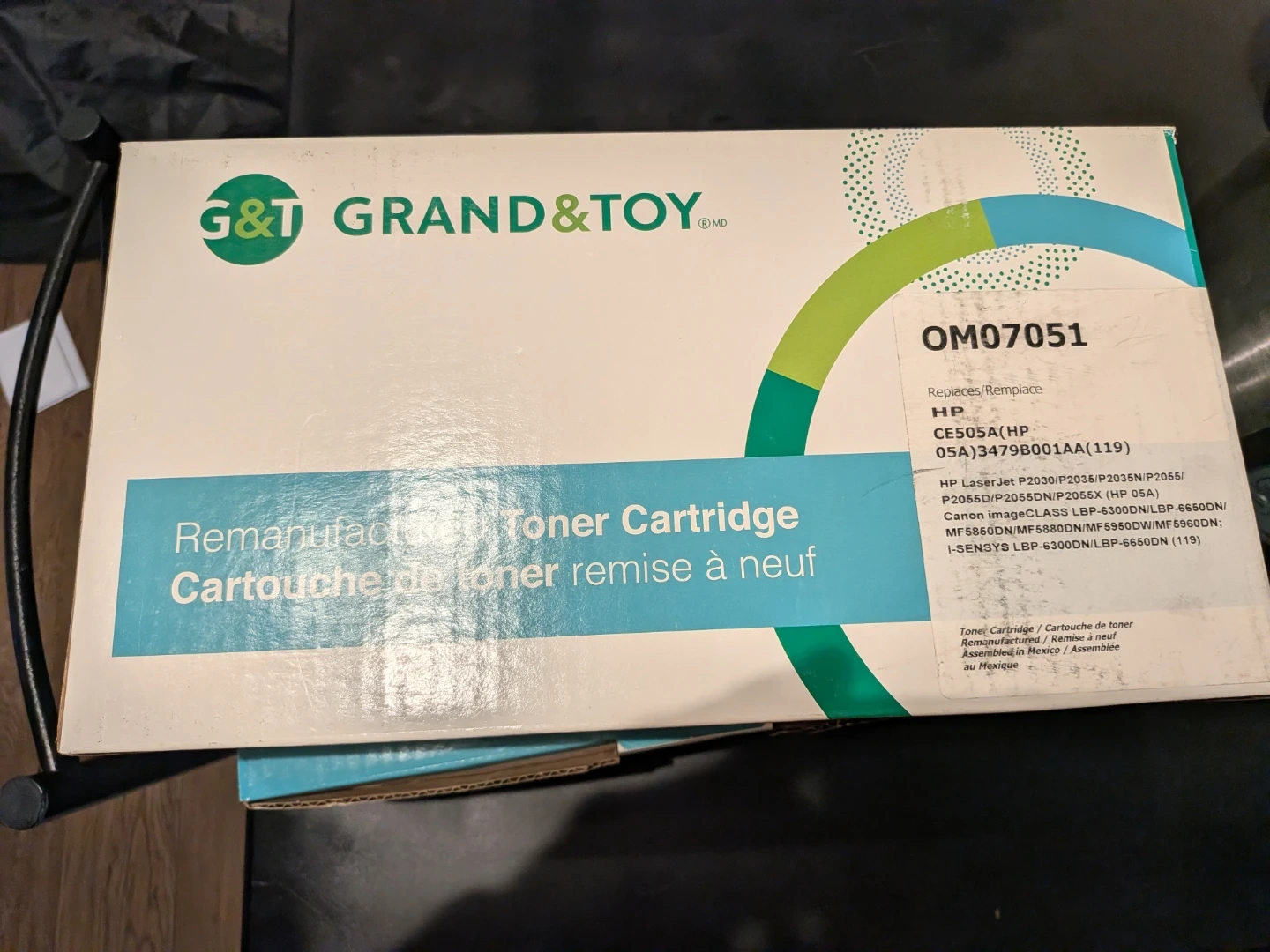 This is a remanufactured toner cartridge from G&T, model OM07051. It replaces HP CE505A toner. This cartridge is compatible with various HP LaserJet and Canon imageCLASS printer models. It's assembled in Mexico.