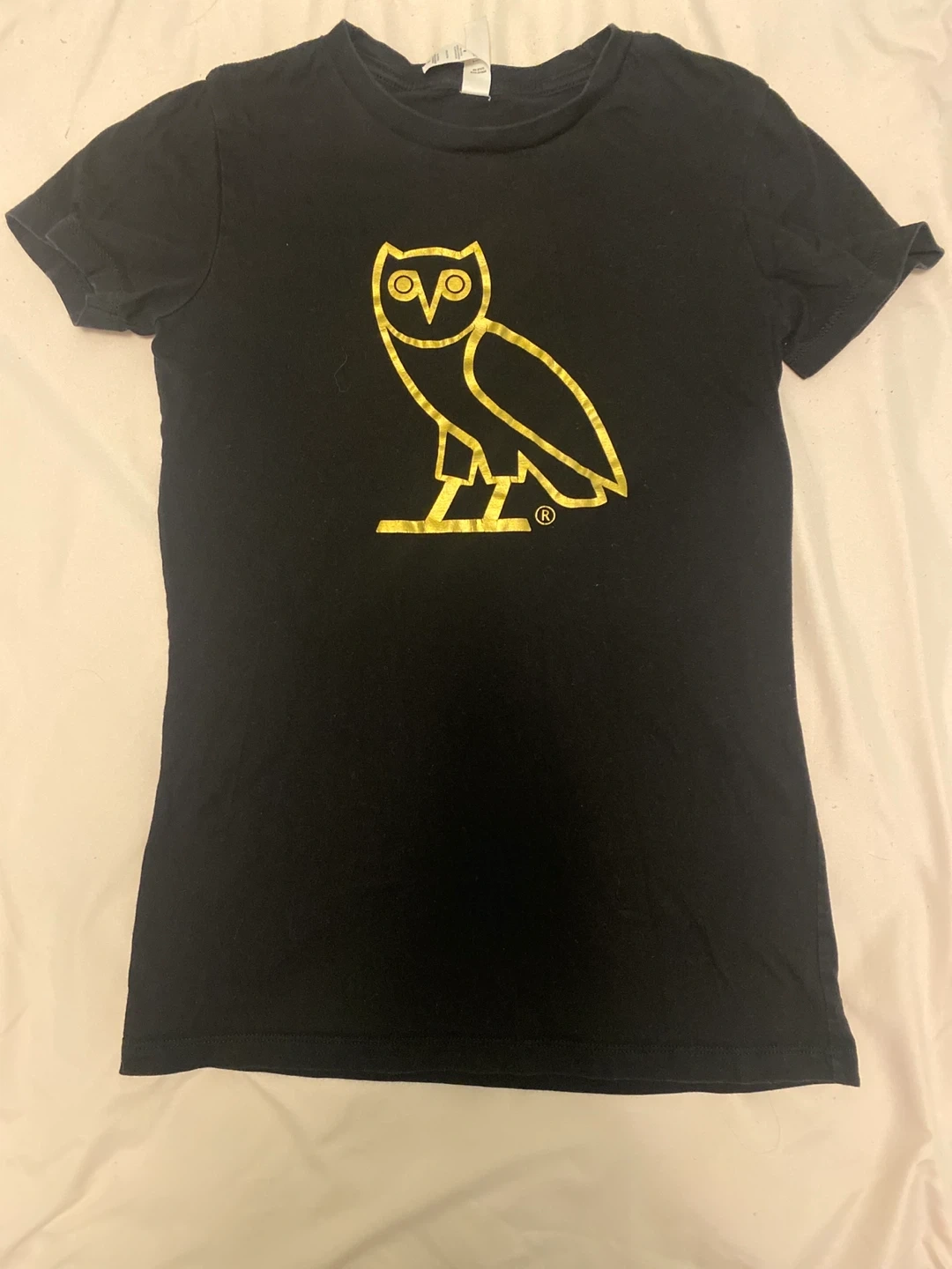 Black t-shirt with a gold owl logo on the front and "STARTED FROM THE BOTTOM." printed on the back. Short sleeves and crew neck. Cotton material.