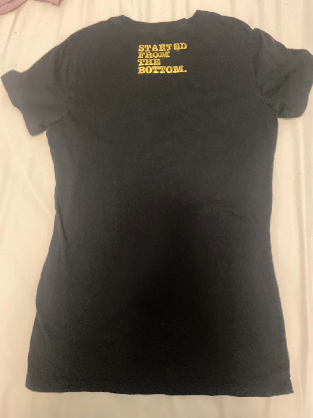 Black t-shirt with a gold owl logo on the front and "STARTED FROM THE BOTTOM." printed on the back. Short sleeves and crew neck. Cotton material.